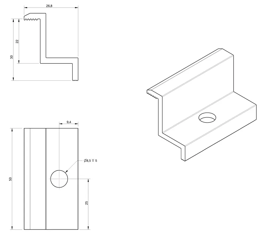 Sidoklämma i aluminium 6060, 30mm, hål M8, för solcellsmoduler.