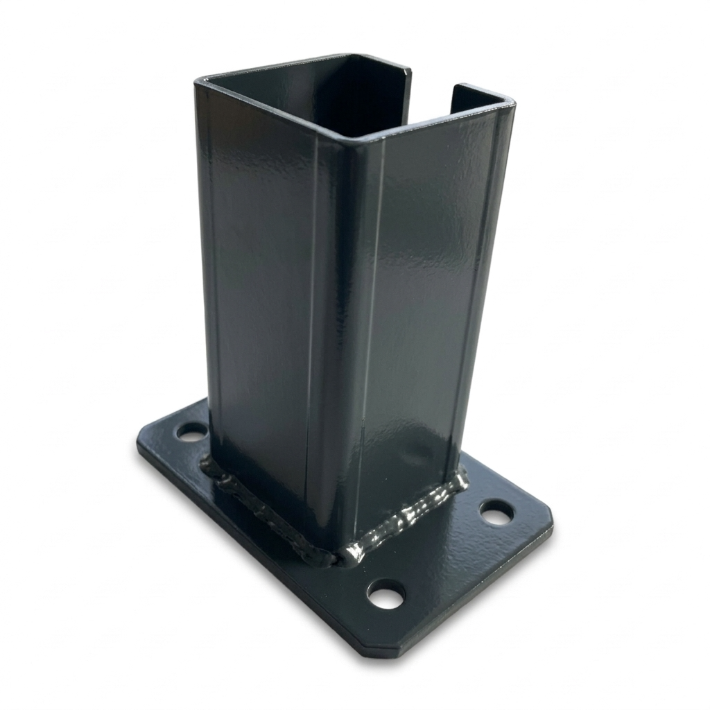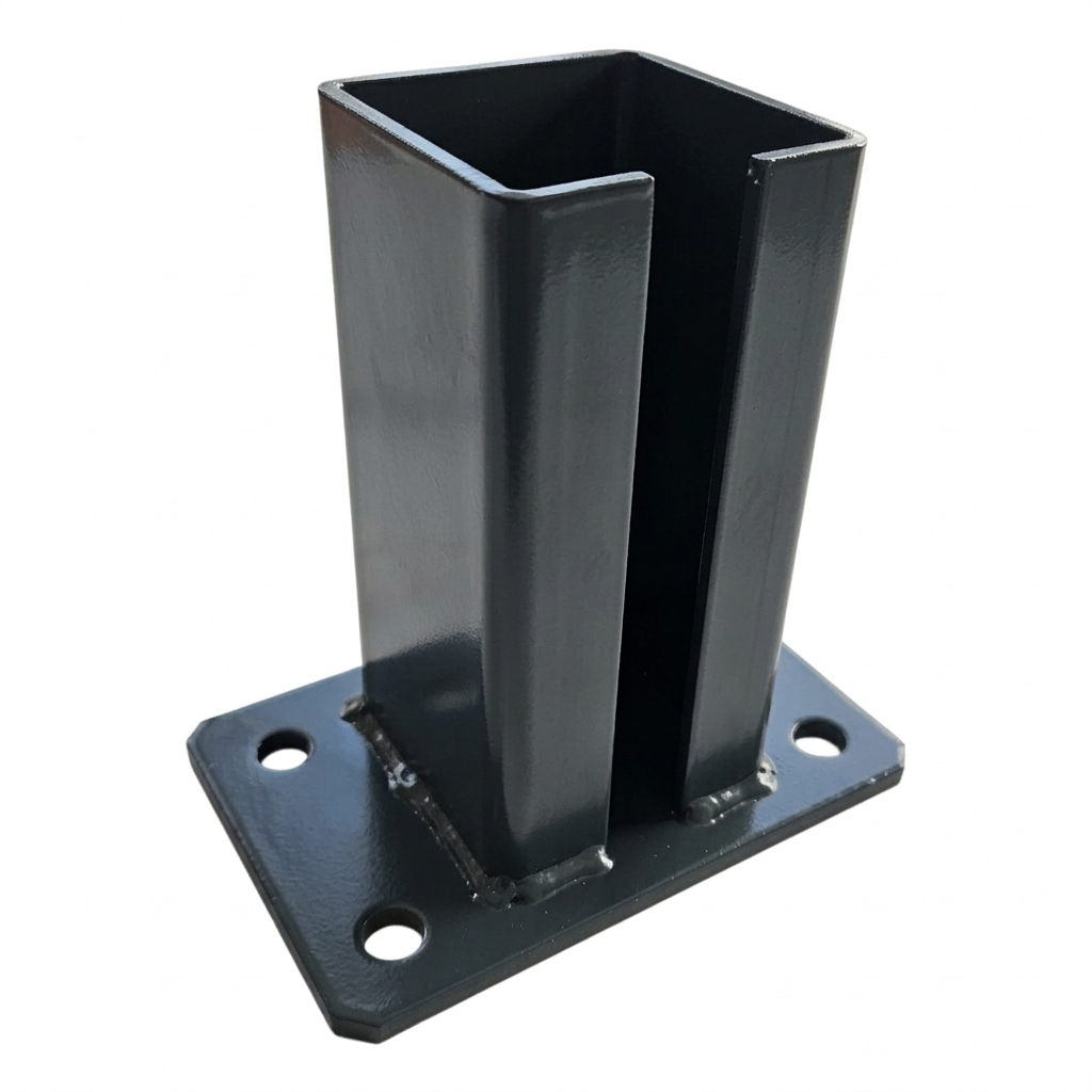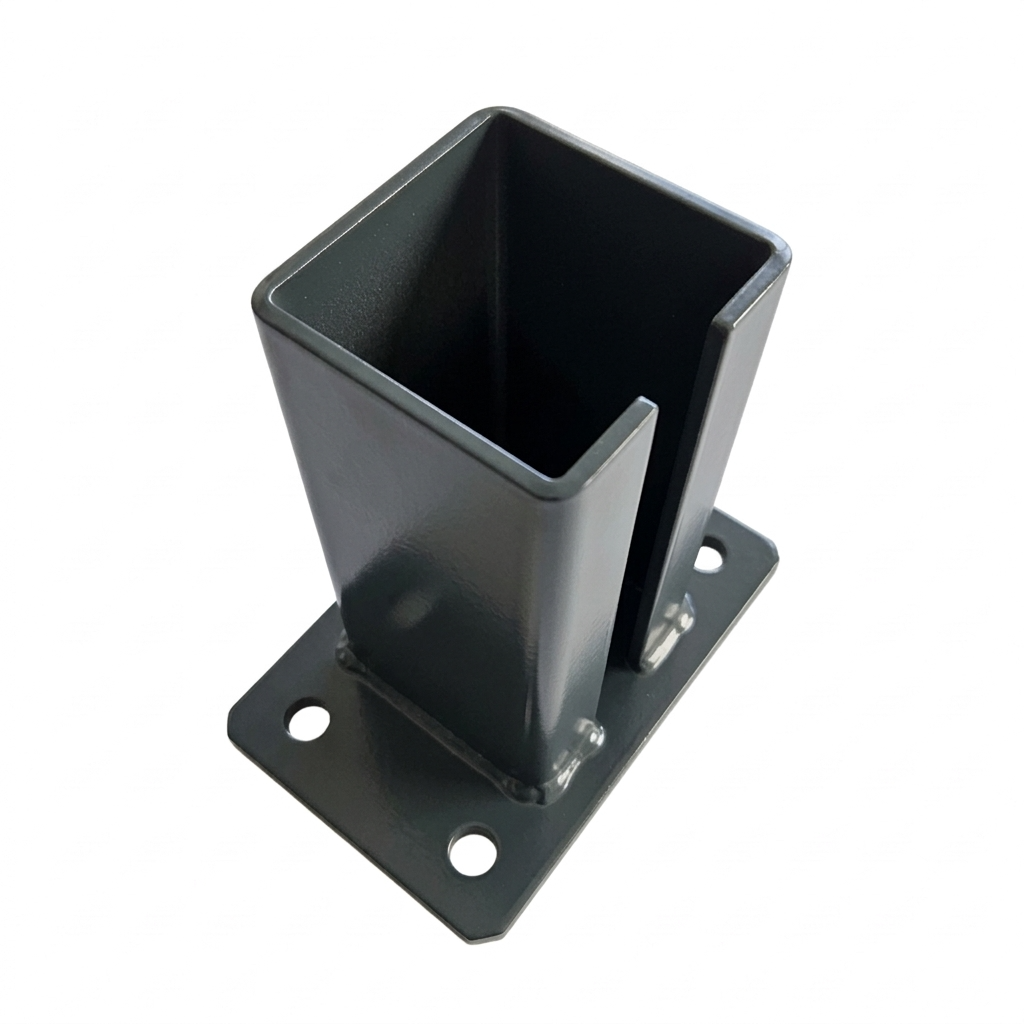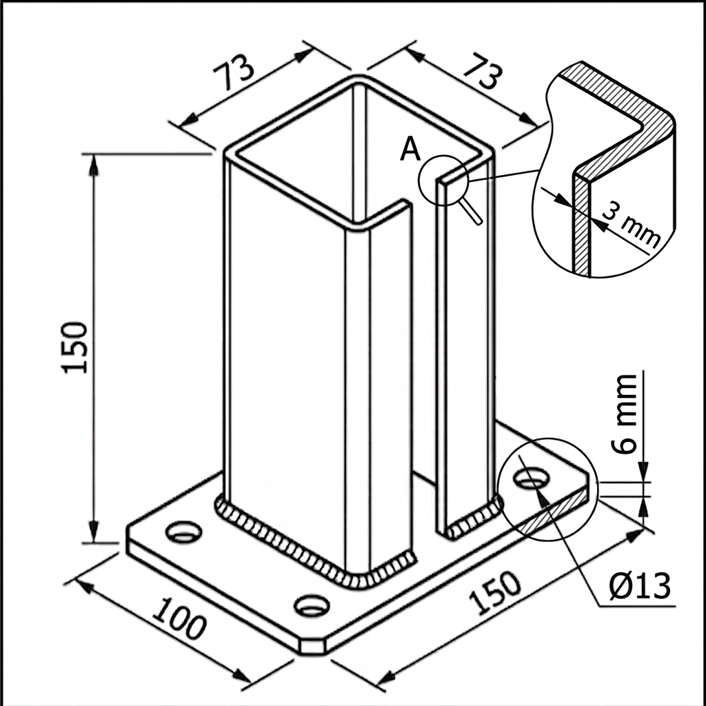 Konstruktionen består av en öppen fyrkantig profil 73×73 mm (anpassad till stolpe 80×80 mm) svetsat till en massiv monteringsplatta med fyra hål för förankringsskruvar. Gropsvets vid profilbasen garanterar solid lastöverföring. Vertikala springan i profilen möjliggör precis anpassning och kompensation av stolptoleranser.