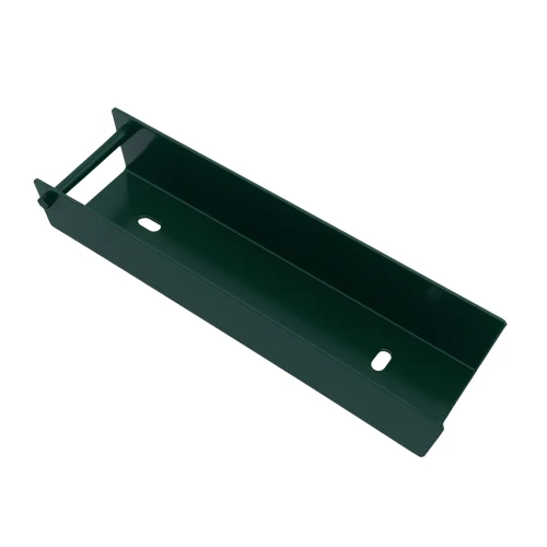 Produkten är tillverkad av galvaniserat stål belagt med pulverlack i grön färg RAL 6005. Dubbelt korrosionsskydd — galvanisering plus pulverlackering — säkerställer mångårig motståndskraft mot väderförhållanden, fukt och korrosion, vilket eliminerar behovet av underhåll. Den estetiska finishen harmoniserar vackert med moderna panelstängsel.