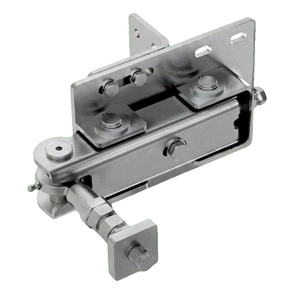 - Övre gångjärn med växel — monteras i den övre delen av grinden vid stolpen, synkroniserar rörelsen av båda grindblad