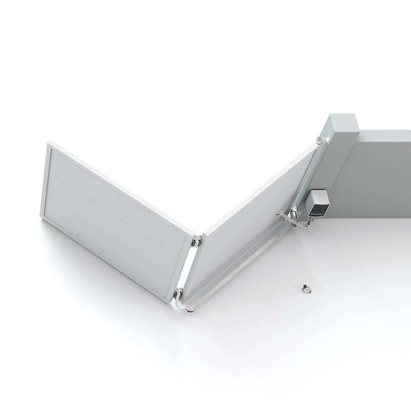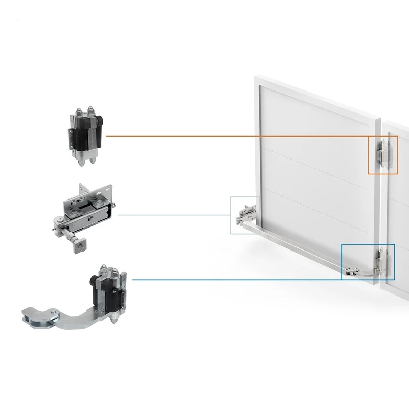 - Nedre gångjärn med växel och arm — monteras i den nedre delen av grindblad, ansvarar för vikdrift; dubbelsidig vikbar transmissionsarm kopplas till botten av första grindblad