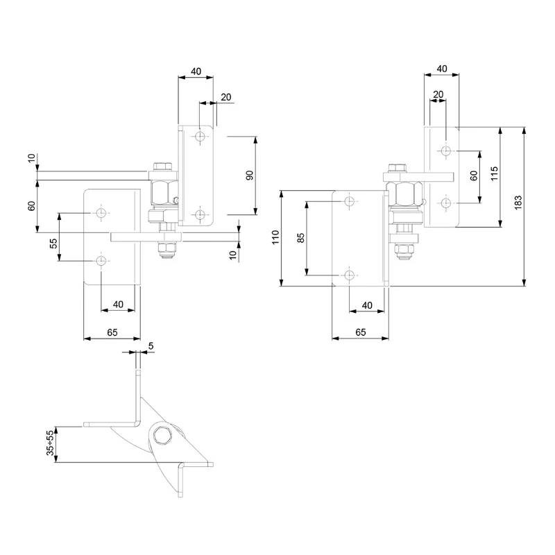 - Hålcentrum nedre plåt vertikalt: 85 mm (höger vy) / 55 mm (vänster vy)