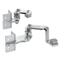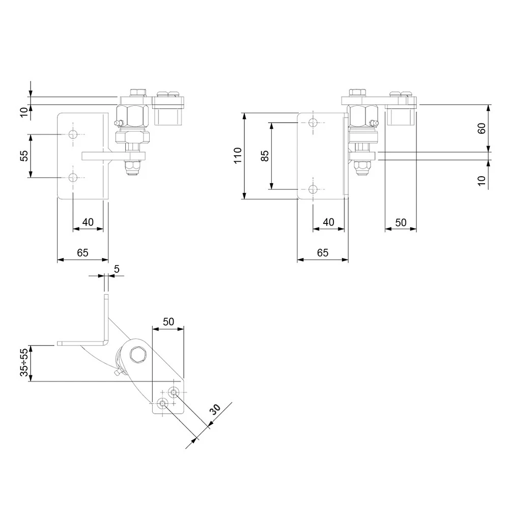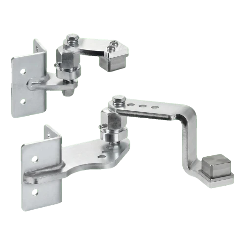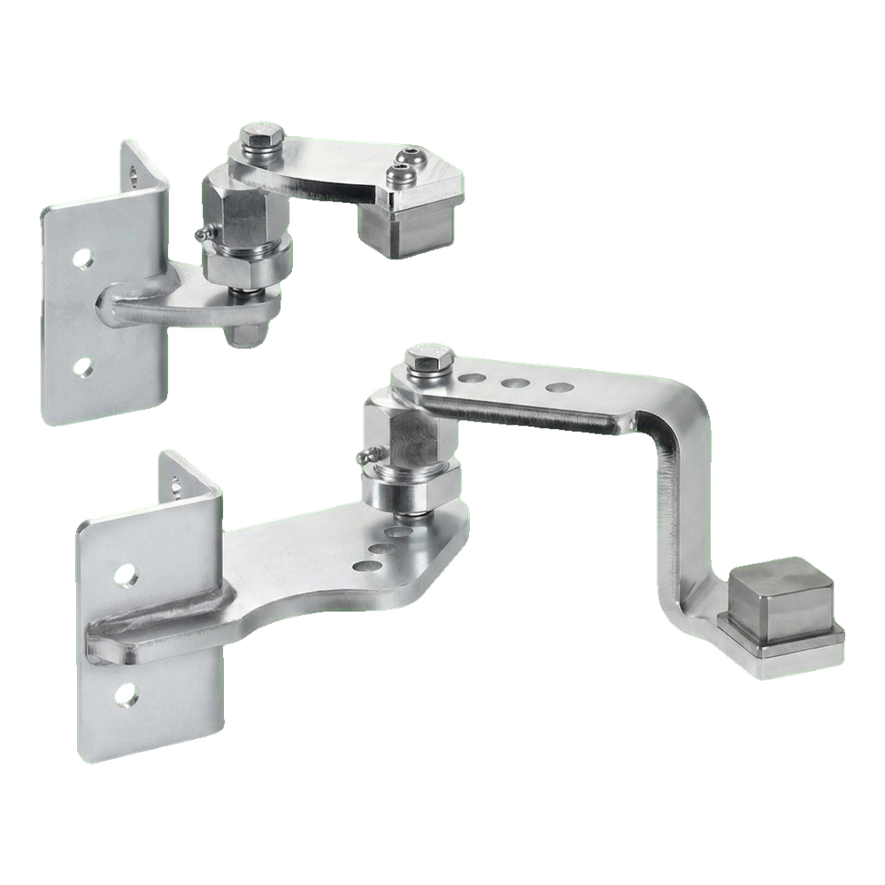 Gångjärnen är avsedda för svetsning på stålstolpar 50×50 mm samt för montering på betongstolpar med monteringshål. Ledmekanismen med excentrisk skruv möjliggör smidig justering av grindflyglarens vinkel och nivå efter montering — det finns ingen anledning att perfekt nivellera stolparna vid betonggjutningen. Smörjnipplarna inbyggda i lederna säkerställer enkel underhåll — periodisk smörjning räcker utan att behöva demontera hela gångjärnet.