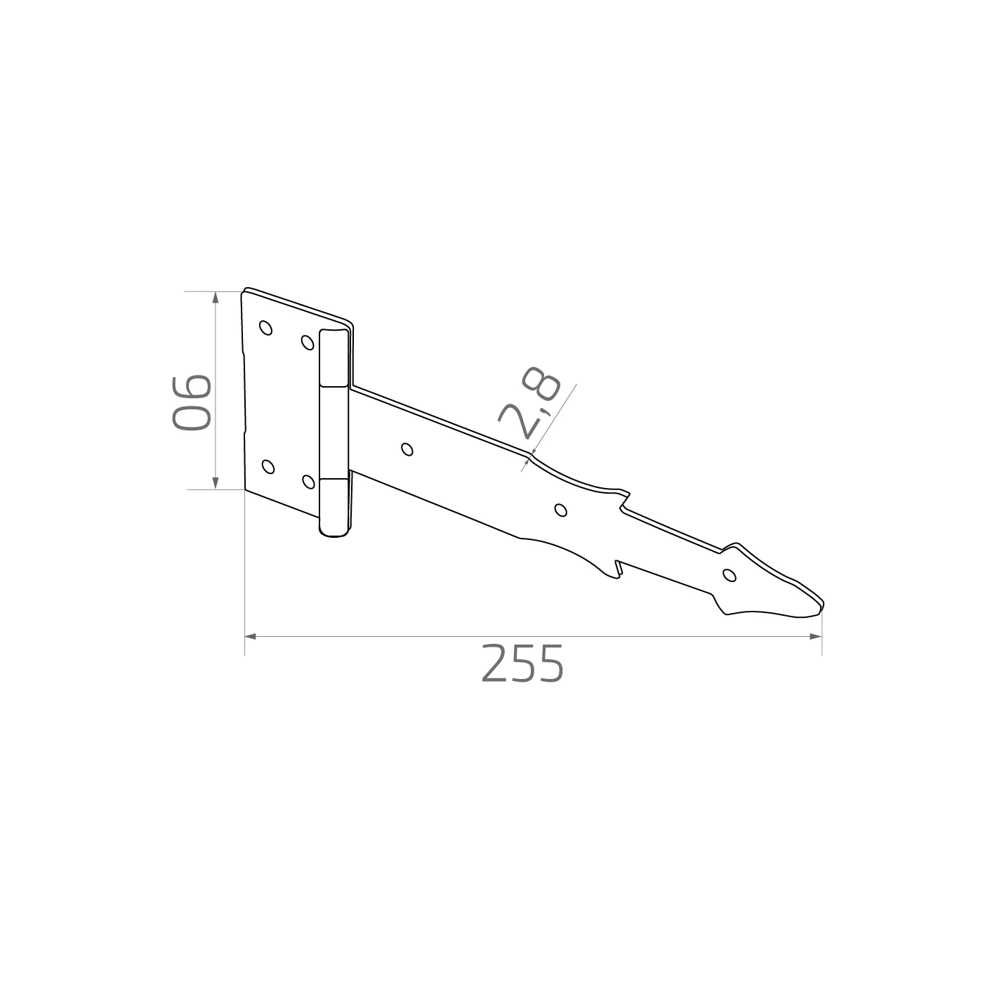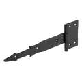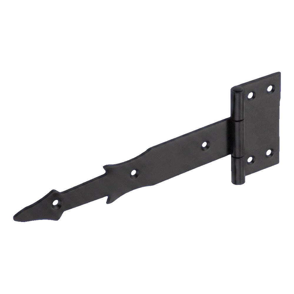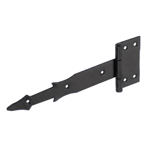 Alkovgångjärn 250 mm i svart färg är ett hållbart beslag avsett för montering av dörrar, portar, trädgårdsgrindar och alkov. Den dekorativa armens avslutning i form av en spets ger gångjärnet en dekorativ karaktär, vilket gör att det passar utmärkt med trä- och metallkonstruktioner för staket och trädgård.