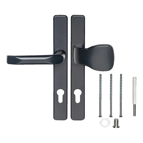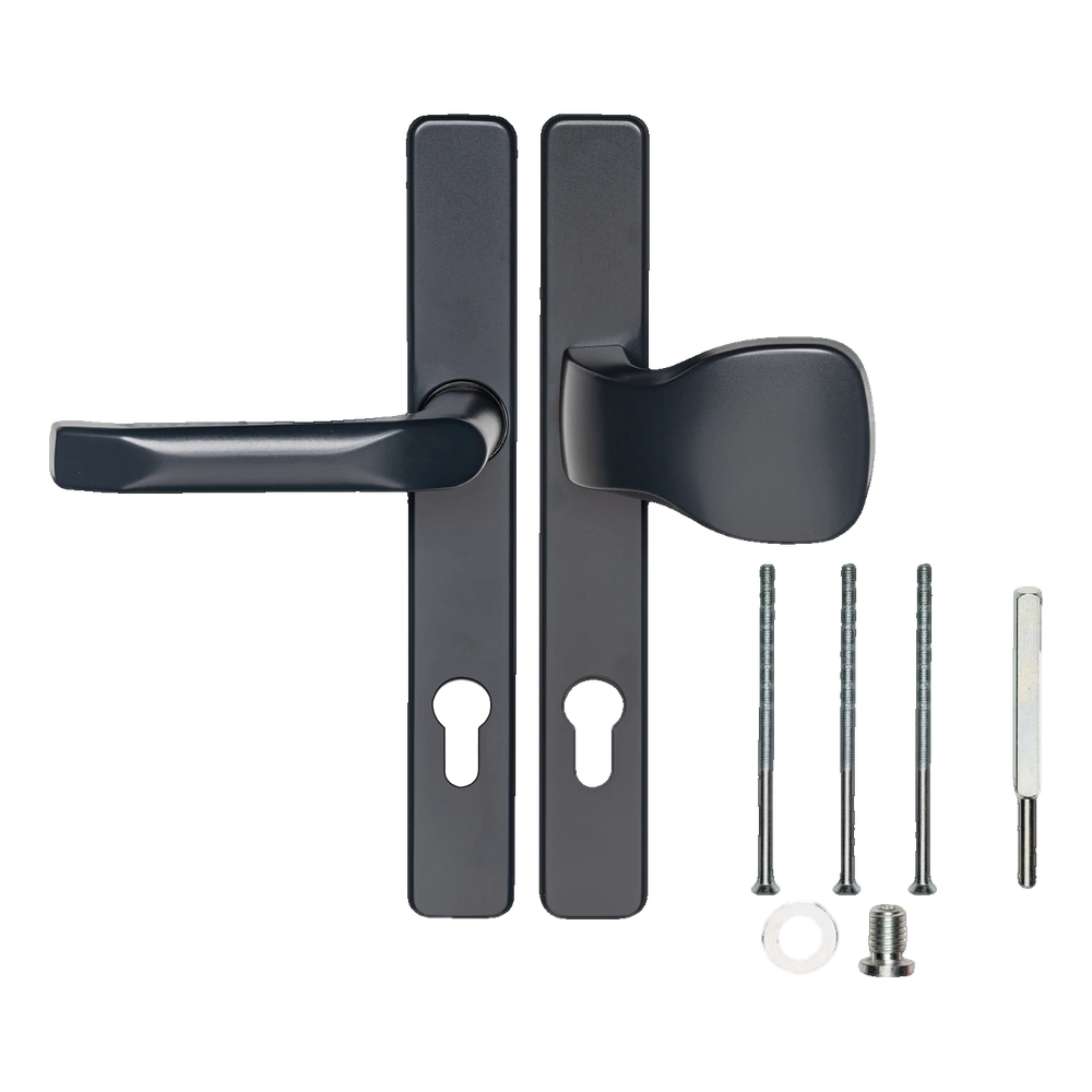 Antracit dörrhandtag med skylt och knopp är en komplett uppsättning avsedd för montering i dörrar utrustade med lås med cylinderinsats. Kombinationen av klassiskt handtag på insidan med ergonomisk knopp (handgrepp) på utsidan ger bekväm och säker dörrmanövrering — idealisk lösning för entrédörrar, grindar och portar.