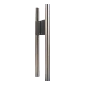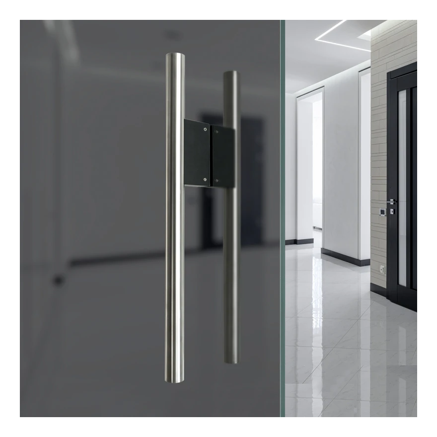 Mångsidig montering är den viktigaste fördelen med detta handtag. Den finslipade ytan på det rostfria stålet gör att röret är exceptionellt slätt och sammetsliknande vid beröring, vilket bidrar till komforten vid daglig användning. Den klassiska, tidlösa formen passar utmärkt med både moderna kontorsglasningar och traditionella innerdörrar. Konstruktionen med två parallella rör förbundna med svart fäste skapar en elegant färgkontrast som framhäver den minimalistiska designen.