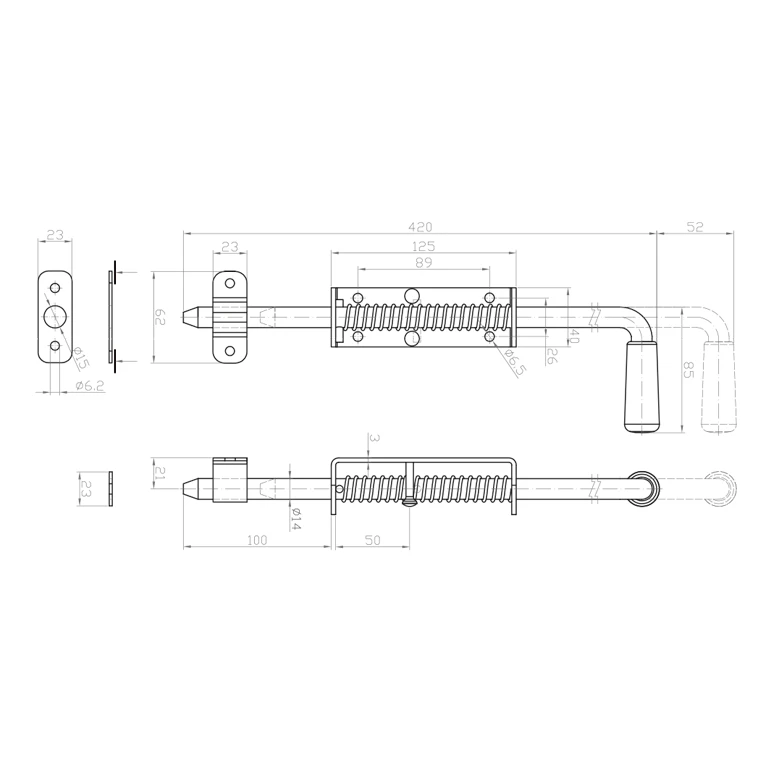 Den tekniska ritningen visar bultens fullständiga geometri med angivna mått. Tack vare den enkla konstruktionen och standardiserade monteringspunkterna kan produkten användas både i nya stängselsinstallationer och vid renovering av befintliga grindar. Fjädermekanismen håller automatiskt bulten i låst läge, vilket eliminerar risken för oavsiktlig öppning av grinden på grund av vind eller vibrationer.