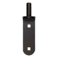 Tappen är tillverkad av svart stål, vilket ger hög mekanisk hållfasthet och estetiskt utseende som harmoniserar med staket och bommar i mörka färgscheman. Vinkelprofilen möjliggör montage platt mot stolpen — tappen sticker ut vinkelrätt och bildar en rotationsaxel för gångjärnet. Två fyrkantiga monteringshål möjliggör snabb och säker skruvning av elementet, vilket avsevärt påskyndar installationsarbetet på byggarbetsplatsen.