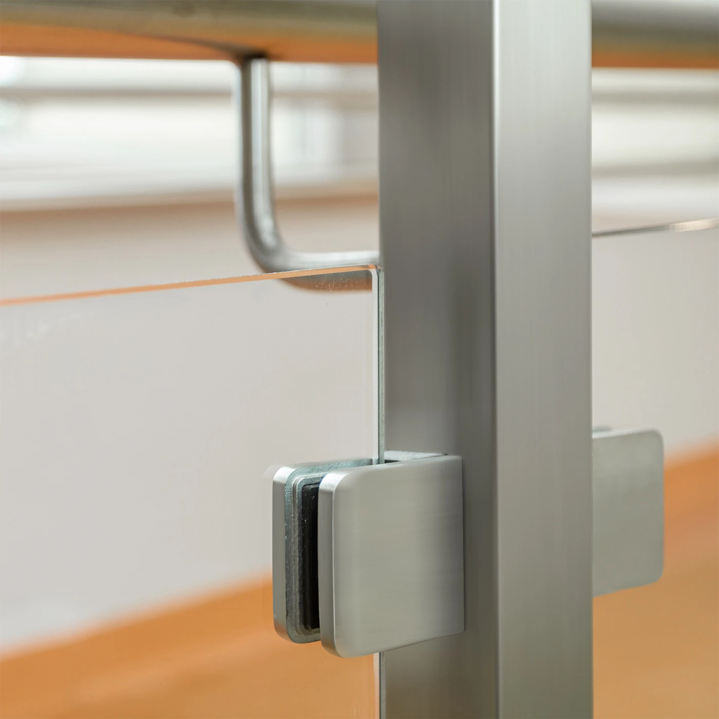 Hallaren är avsedd för system med plan monteringsyta — rektangulära stolpar, stalprofiler och väggar. Den kompakta formen 45×45 mm ger ett diskret utseende, och den spegelblanka ytan harmoniserar med moderna interiörer. Tack vare glasets tjockleksintervall 6–10,76 mm passar den för bade enskilda härdat glas och laminerat glas av VSG-typ. Monteringen bestar av att skruva fast hallaren i underlaget och skjuta in glasskivan i sparet med tätningen — snabbt och utan specialverktyg.
