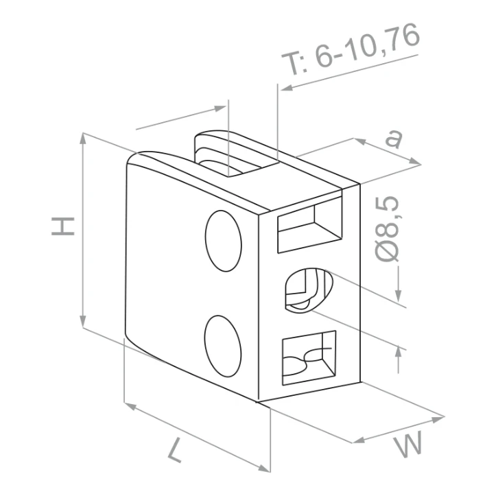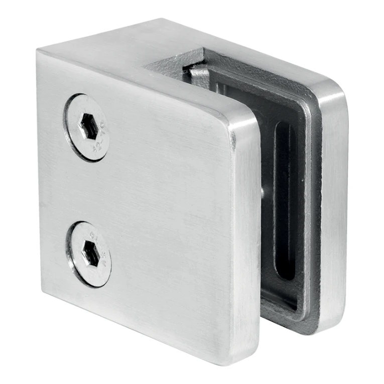 Rektangulär glashallare i rostfritt stal AISI 316 med satinfinish, avsedd för montage pa plan yta. Den kompakta konstruktionen med matten 45 × 45 × 26 mm möjliggör säker infästning av glas med tjocklek fran 6 till 10,76 mm – bade härdat och laminerat glas.