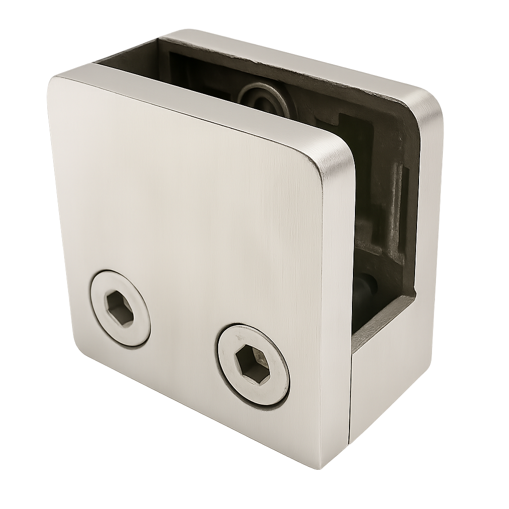 Den robusta gjutna konstruktionen i rostfritt stal ger hög mekanisk hallfasthet och langvarig estetik. Tva insexskruvar möjliggör exakt atdragning av glasskivan, och konsol-systemet med säkerhetsstift garanterar stabil och säker infästning av panelen. Produkten är avsedd för inomhusbruk – idealisk för glasräcken, kontorspartitioner och duschkabiner.