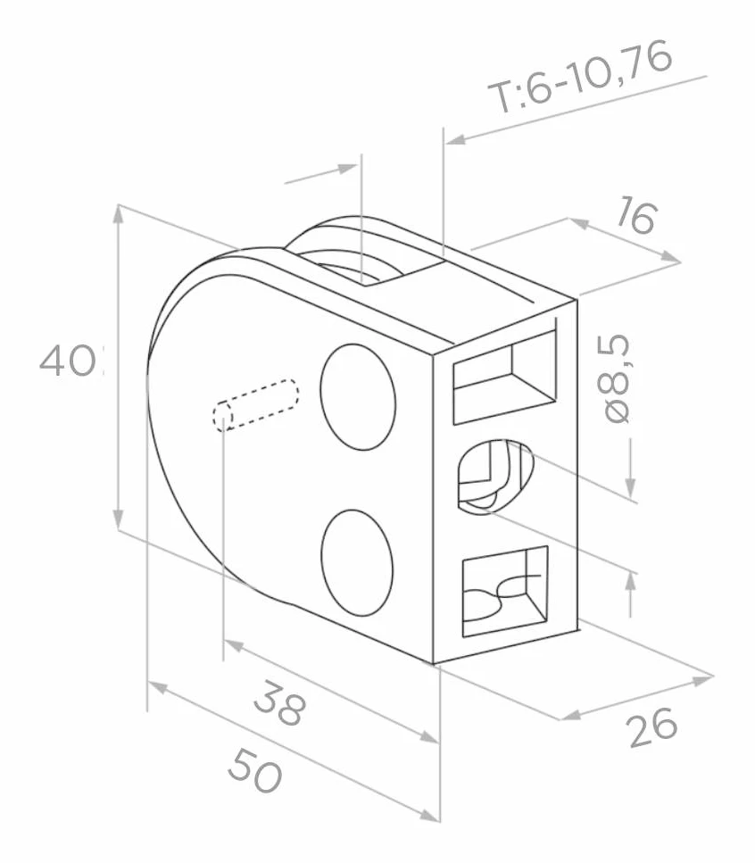 Glashållare 50×40×26 mm i rostfritt stål AISI 316 med satinfinish — en pålitlig lösning för montering av glaspaneler på plana ytor. Produkten är avsedd för professionella tillämpningar i räcken, skärmar och glasinklädnader där hög korrosionsbeständighet och ett estetiskt, modernt utseende krävs.