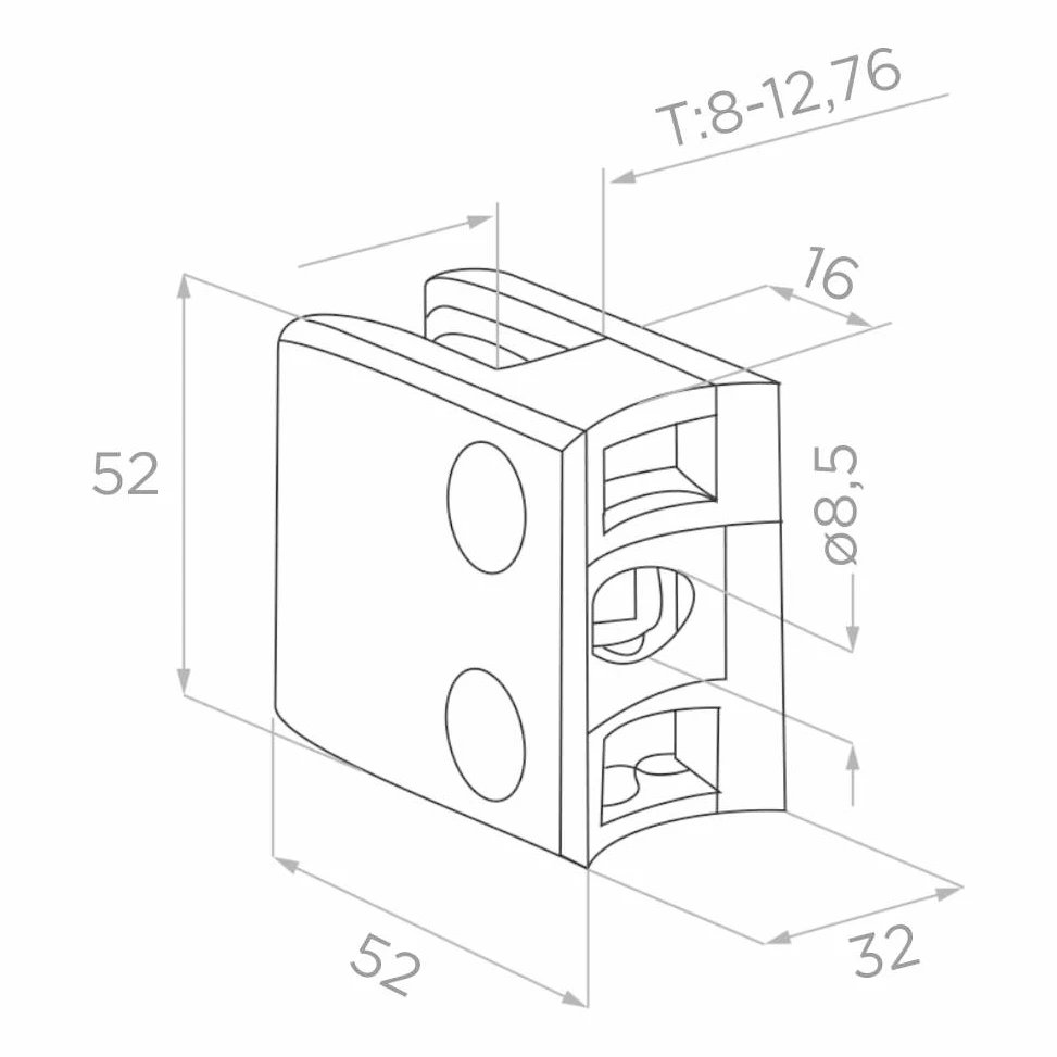 Glashållare 8-12,76 mm 52x52x32 mm konsol och pin AISI 304 system 42,4 mm satin