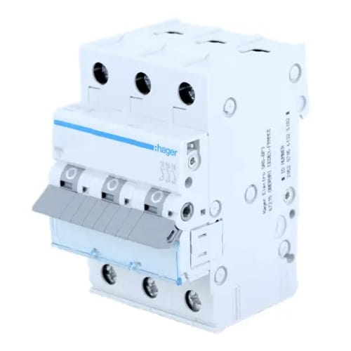 Överströmsskydd MCB C 25A 3P 6kA MCN325E från HAGER, även känt som installationsbrytare, används för att skydda kablar och ledningar mot konsekvenserna av kortslutningar och överbelastningar.