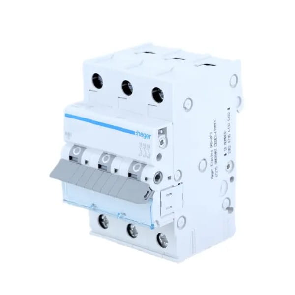 Överströmsbrytare C 50A 3P 6kA MCN350E av Hager, även känd som en installationskopplingsbrytare, används för att skydda kablar och ledningar från överbelastning och kortslutning.