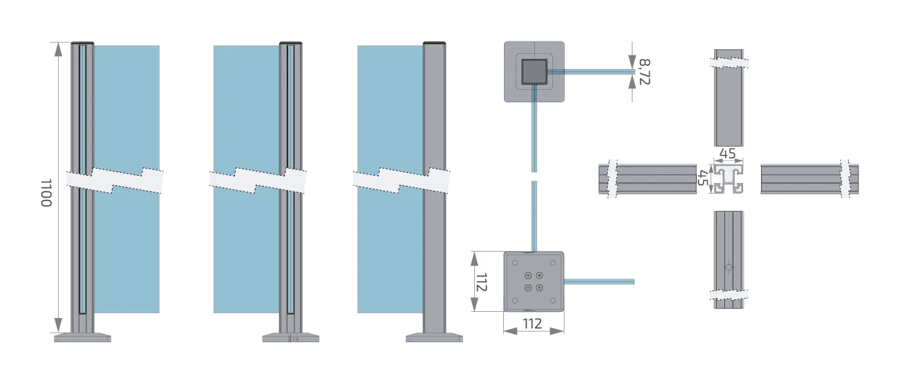 Profilen med tvärsnitt 45×45 mm och höjd 1100 mm är avsedd för laminerat glas med tjocklek 8,72 mm. Monteringssystemet i golv med platt bas 112×112 mm garanterar konstruktionens stabilitet och möjliggör snabb förankring i betong eller annat bärande underlag. Den eleganta svarta, matta ytan som uppnåtts genom pulverlackering säkerställer motståndskraft mot väderförhållanden och ger räckena en modern, minimalistisk karaktär.