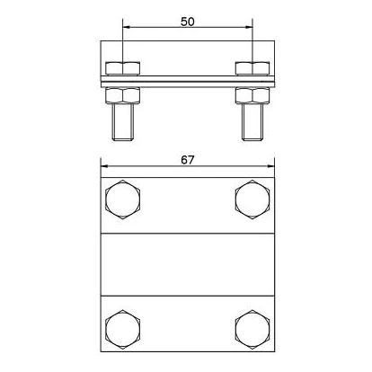 Yttre mått på klämman är 50 × 67 mm, vilket ger en kompakt konstruktion med bibehållen full funktionalitet. Den lilla storleken underlättar montering i begränsat utrymme, t.ex. i inspektionsbrunnar eller vid jordningsskenor.