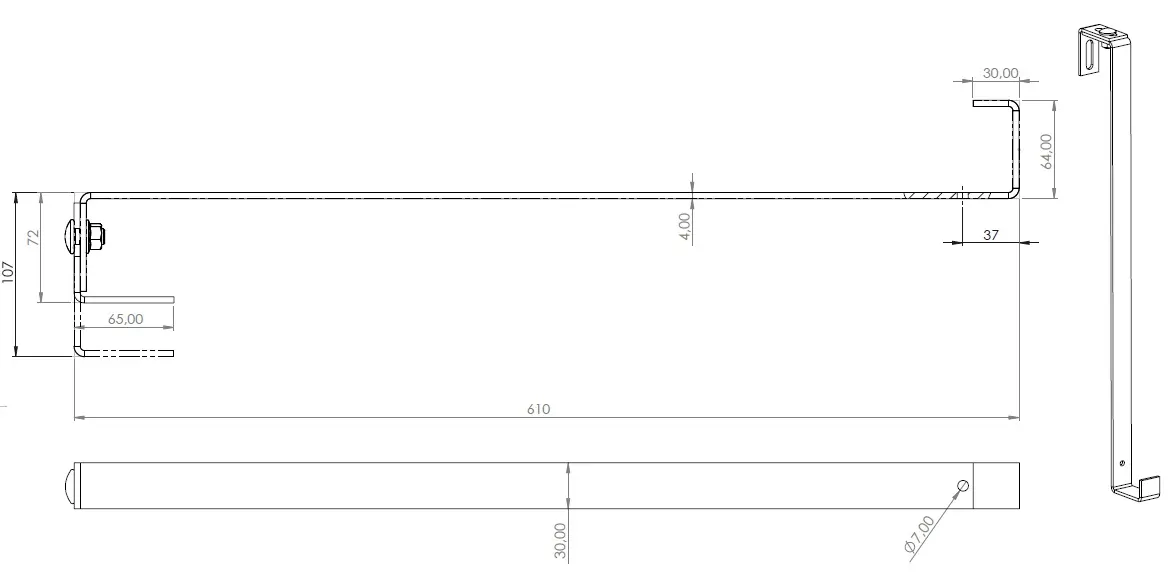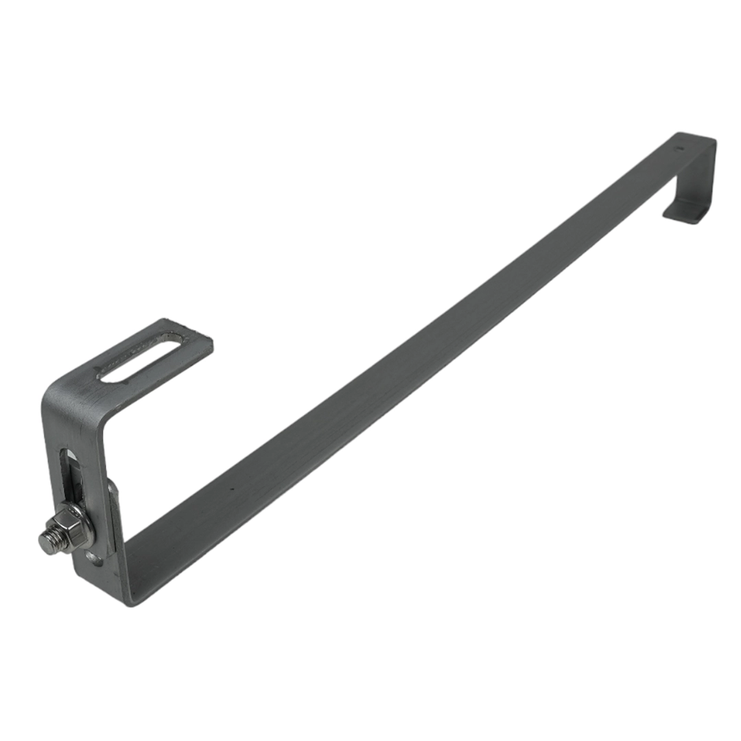 Justerbar takkrok S för snedtak, rostfritt stål 1.4016 med måtten 610x30x4 mm och M10-hål för profil till solcellssystem.