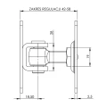 Varje monteringsplatta har två hål Ø7 mm placerade med avstånd 56 mm, vilket underlättar anpassning till typiska stängselpelare. Gångjärnet levereras i monterat skick — det räcker att skruva fast det till konstruktionen och justera bladets avstånd med hjälp av M12-gängan.