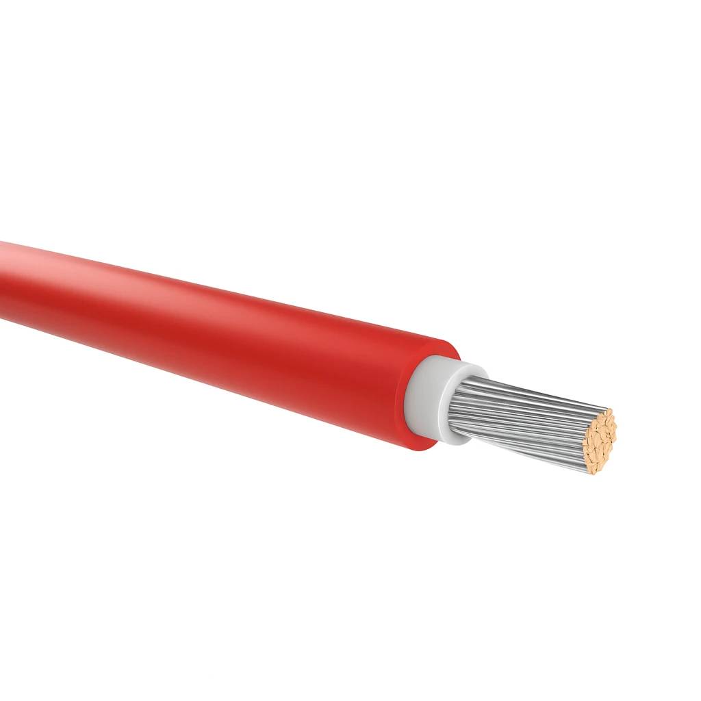 Fotovoltaisk kabel H1Z2Z2-K 1x10 mm2 i röd färg är en pålitlig komponent i varje PV-anläggning. Tack vare den förtenta kopparledaren med 10 mm2 tvärsnittsarea säkerställs låga överföringsförluster även över långa kabelsträckor – från modulsträngar ända till växelriktaren.