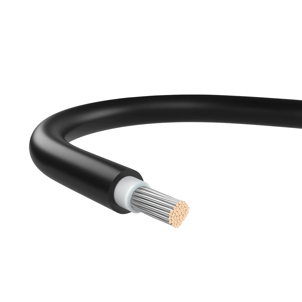 Solarkabel H1Z2Z2-K 1x10 mm2 i svart färg är en pålitlig komponent i varje solcellsanläggning. Tack vare den förtenta kopparledaren med 10 mm2 tvärsnitt säkerställs låga överföringsförluster även över långa kabelsträckor – från modulsträngar ända fram till växelriktaren.