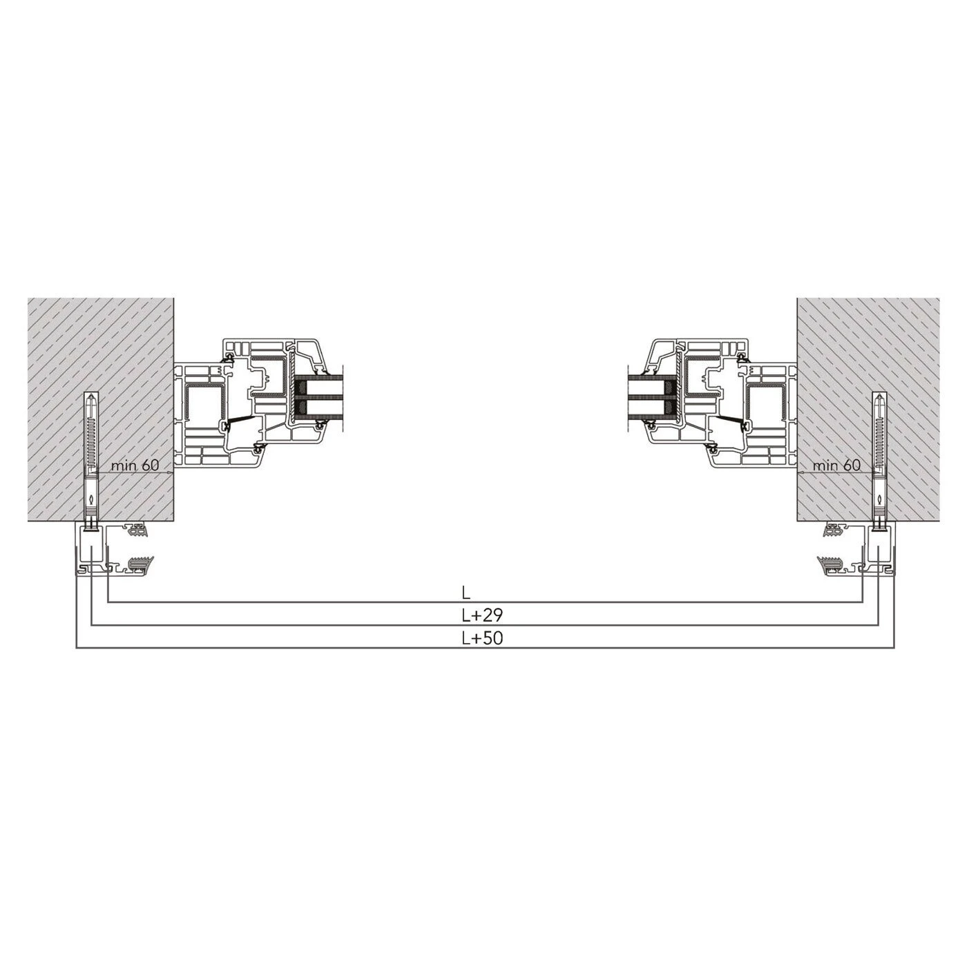- L + 50 mm — total yttre bredd på systemet (mellan profilernas yttre kanter)
