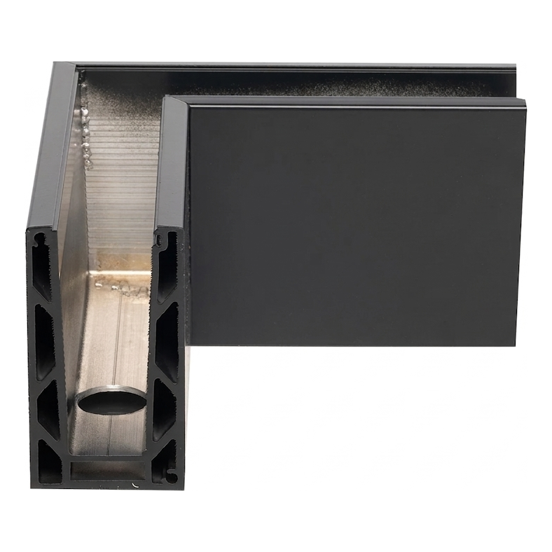 Profilen är tillverkad av aluminium i mörkgrå färg, vilket harmoniserar med moderna golv, antracitfärgade fönsterprofiler och borstlös rostfritt stål. Komponenten är avsedd för inre användning — fungerar bra i korridorer, lobbyer, köpcentrum och kontorsbyggnader där ren glaslinje utan utbyggda stolpar är viktigt.