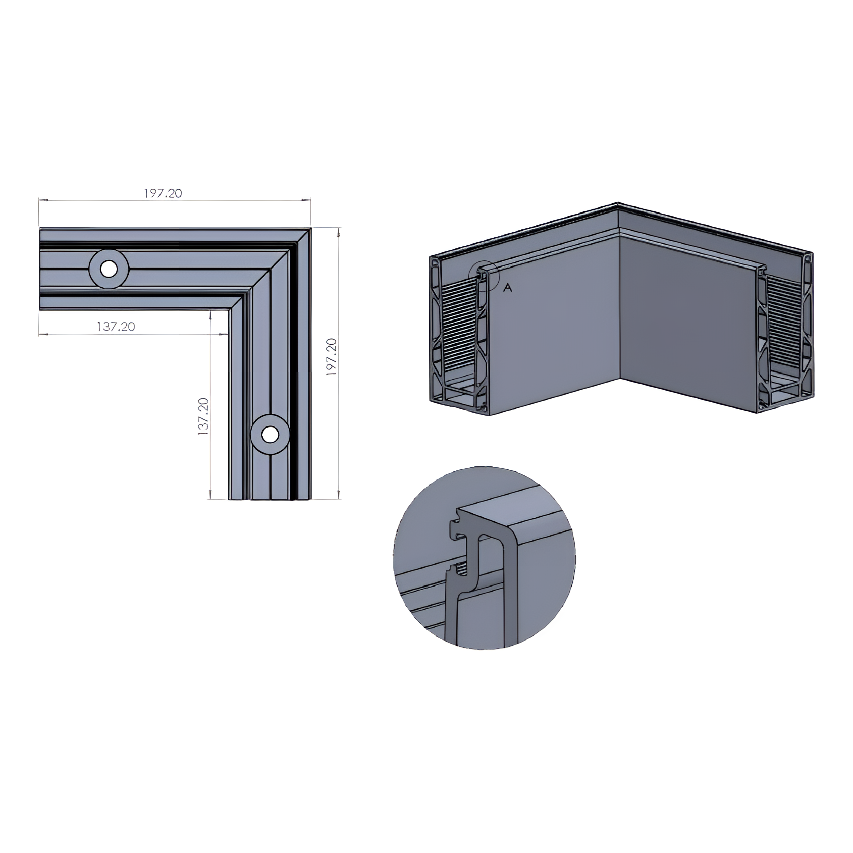 - Geometri 197 × 197 mm — symmetriska hörnproportioner eliminerar behovet av att skära glasskivor och säkerställer optimal förankringsyta