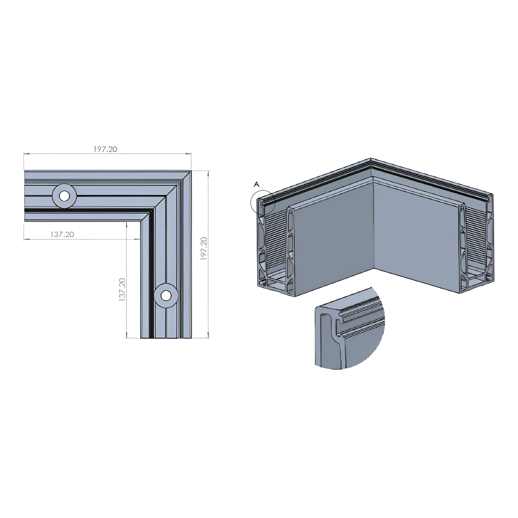 Hörnprofil U av typ KE 100 från märket Kozza är ett element avsett för att slutföra yttre hörn 90° i heltäckande glasräcken monterade ovanifrån. Symmetriska armar med längd 197 mm säkerställer exakt koppling av två glasskivor i rät vinkel — utan förskjutningar och springor, med bibehållen enhetlig profillinje och glas i samma plan.