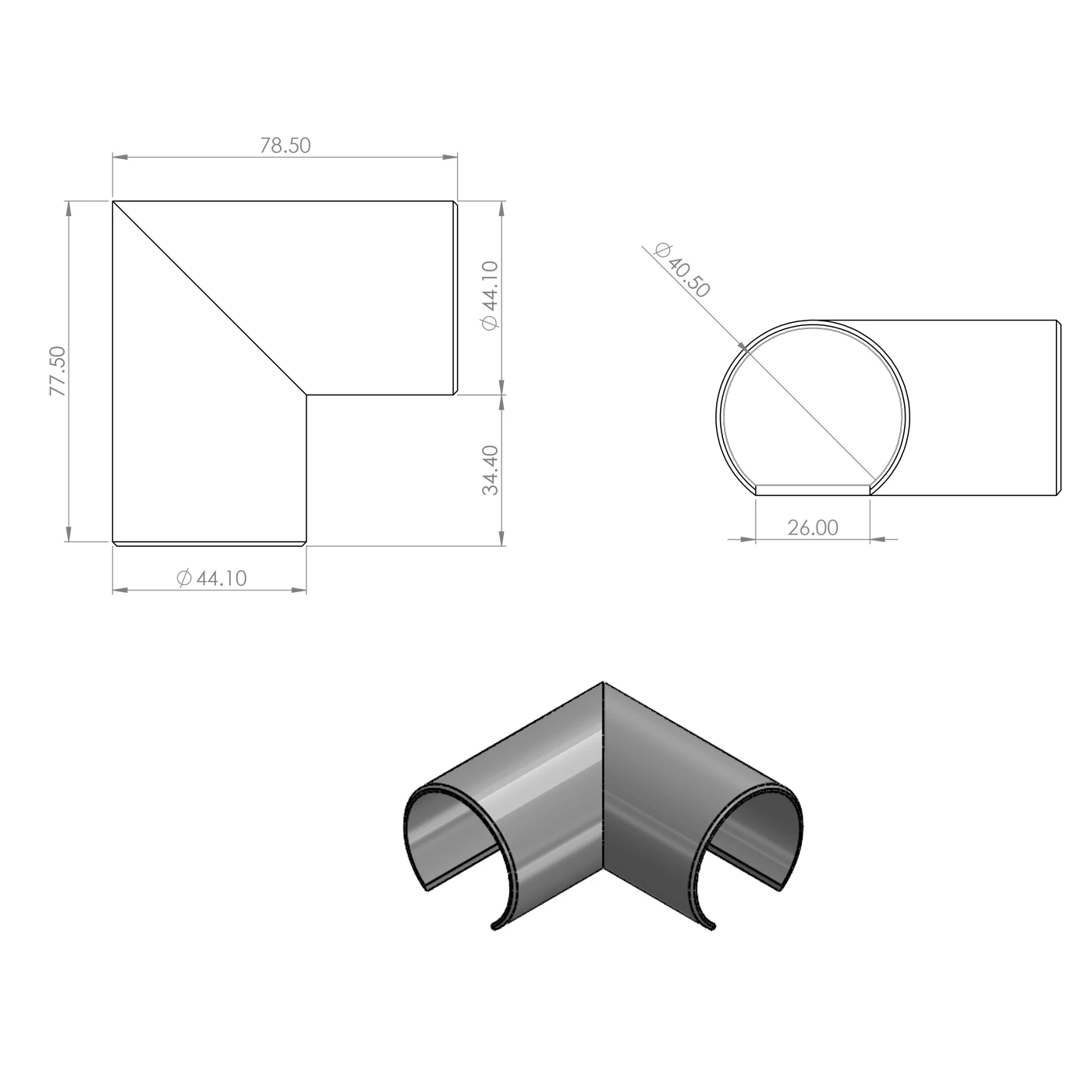 Kontaktens ytterdiameter är 44,10 mm, vilket garanterar säker placering på handledare fi 40 mm (innerdiameter 40,50 mm) och estetisk, smidig övergång utan synliga steg eller ojämna kanter. Armlängden – respektive 78,50 mm och 77,50 mm – ger solid stöd för förbindelsen och motståndskraft mot belastningar från daglig användning av räcket. Monteringsspalten med bredd 26 mm möjliggör enkel påskjutning av elementet på glaslaminatets kant och snabb montering.