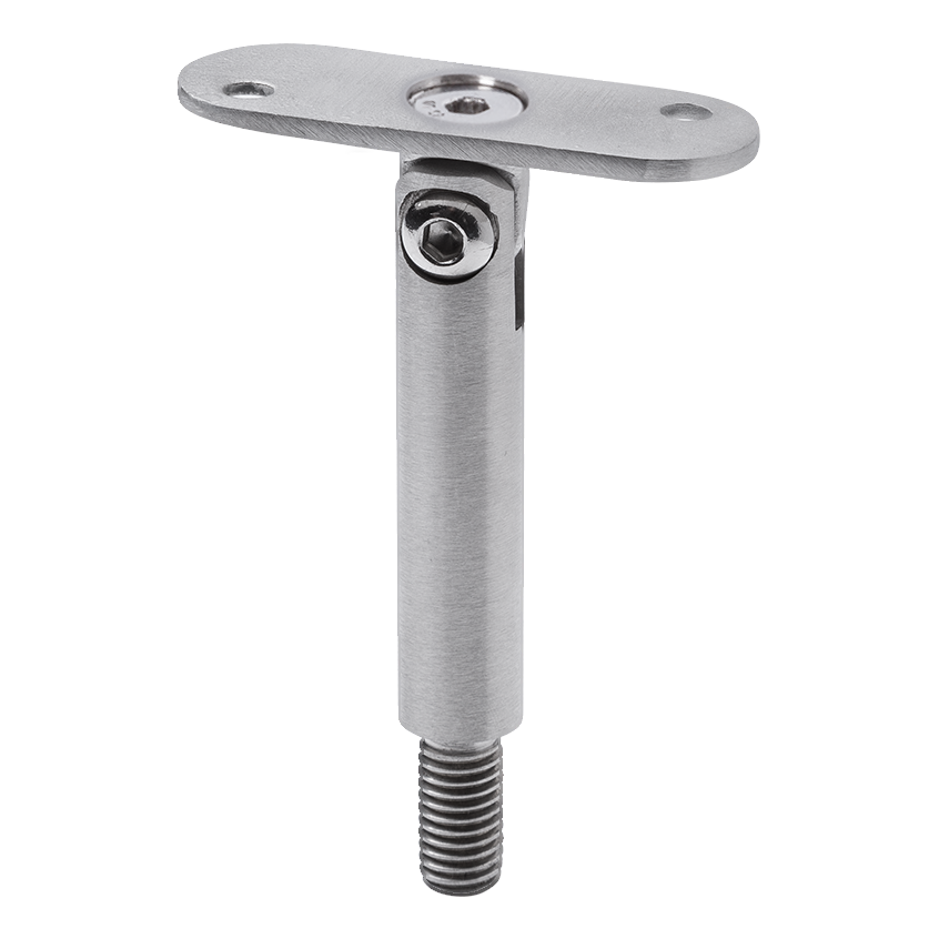 Ledstången är avsedd för montering i balustradsystem av rostfritt stål — särskilt i trappräcken där ändring av räckets ledningsvinkel krävs. Leden möjliggör smidig inställning av monteringsplåtens lutning i förhållande till stångens axel, så att räcket löper parallellt med trapplinjerna utan behov av extra vinkelelement. Den fungerar utmärkt överallt där installatören behöver en flexibel stolpe-räcke-förbindelse: trapphus, mezzaniner, avsatser och gallerier.