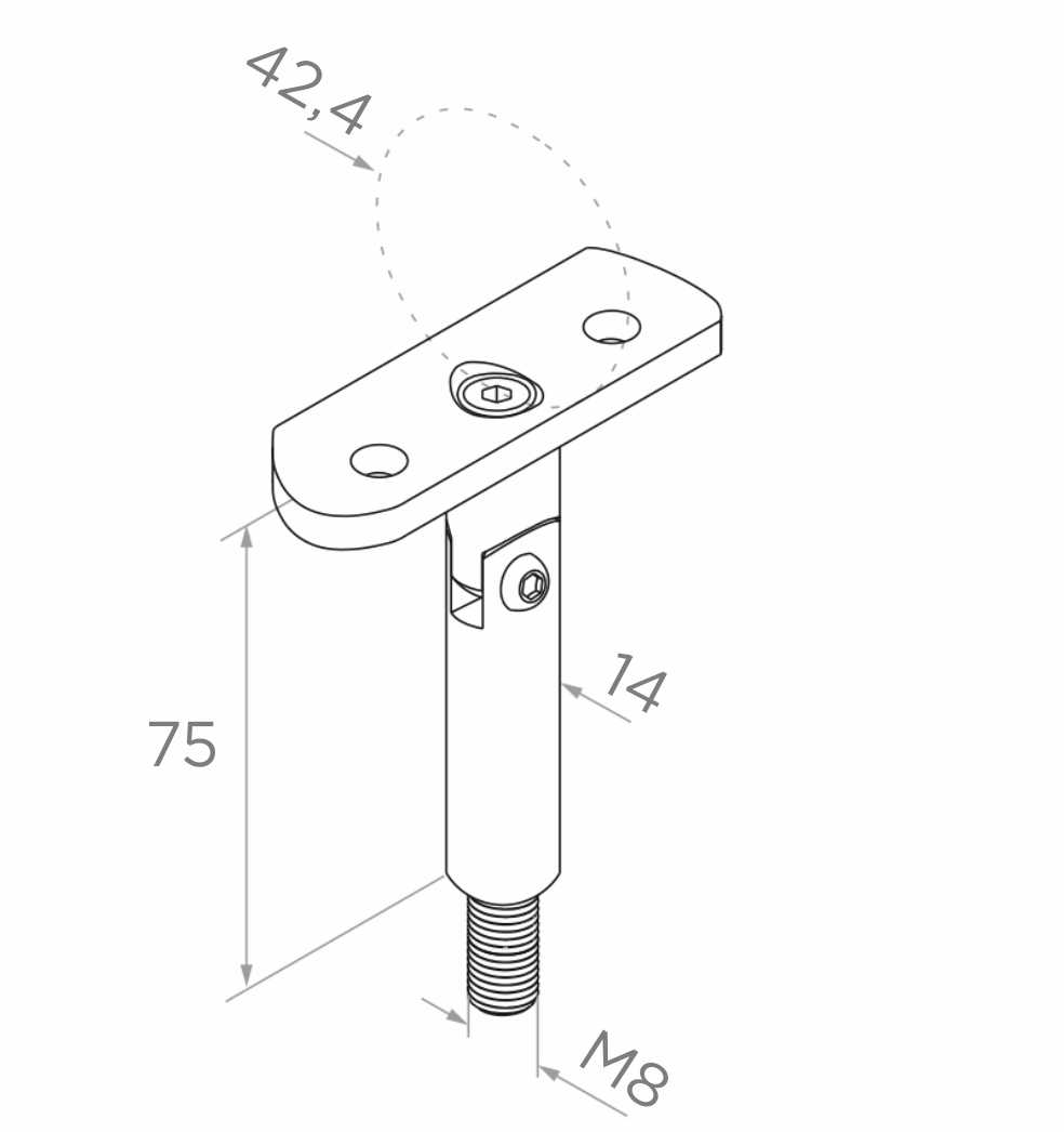 Ledstången består av en cylindrisk tapp med diametern 14 mm och höjden 75 mm, avslutad med yttergänga M8 för inskruvning i stolpe eller bärande element. Den övre delen är försedd med profilerad monteringsplåt anpassad för rör med diametern 42,4 mm, med monteringshål som möjliggör säker fästning av räcket. Ledförbindningen säkras med imbussskruv och tillåter inställning av önskad vinkel, och efter åtdragning säkerställer stabil och hållbar positionering.