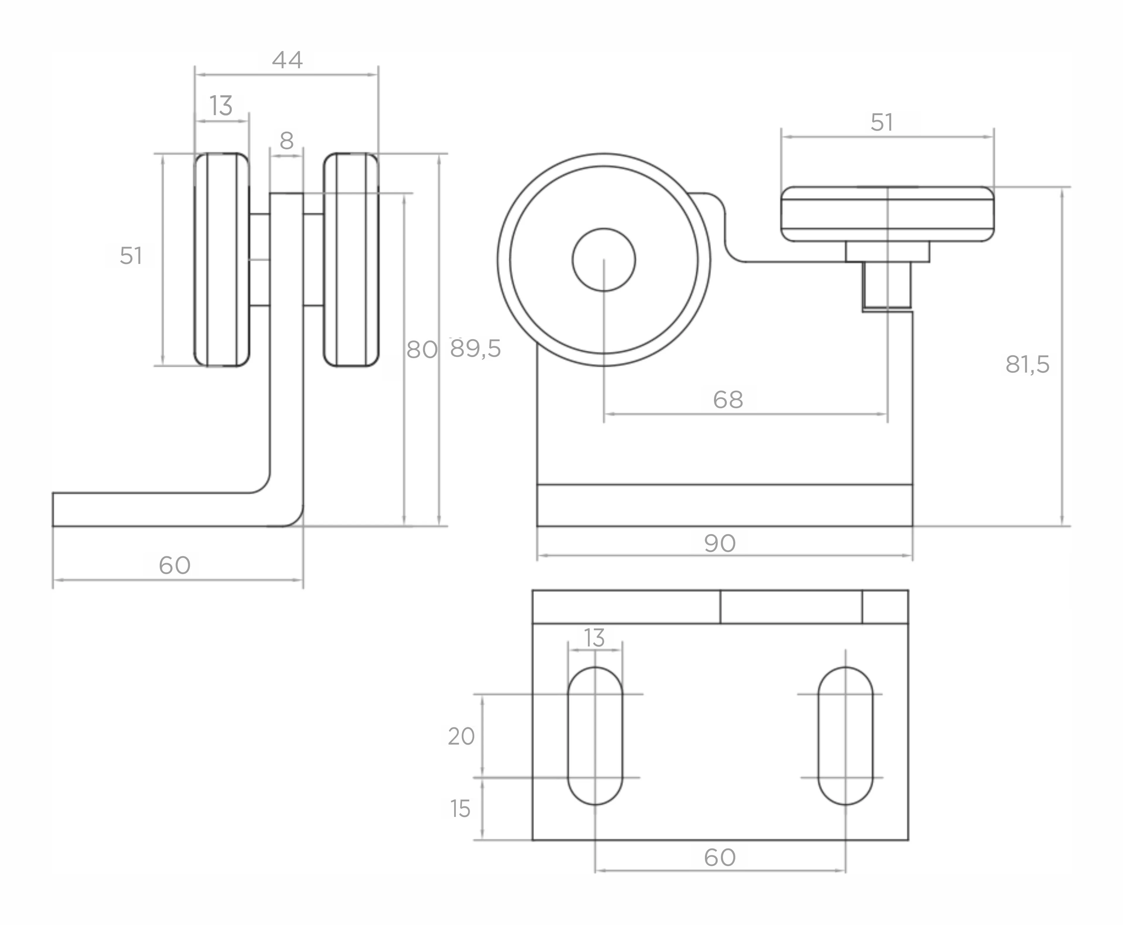Vagnen är monteringsklar – den fästs med skruvar genom de ovala hålen i basen direkt på portbladets konstruktion. Hålen avlånga form möjliggör positionsjustering inom några millimeter, vilket är avgörande för att rikta in porten efter installation.