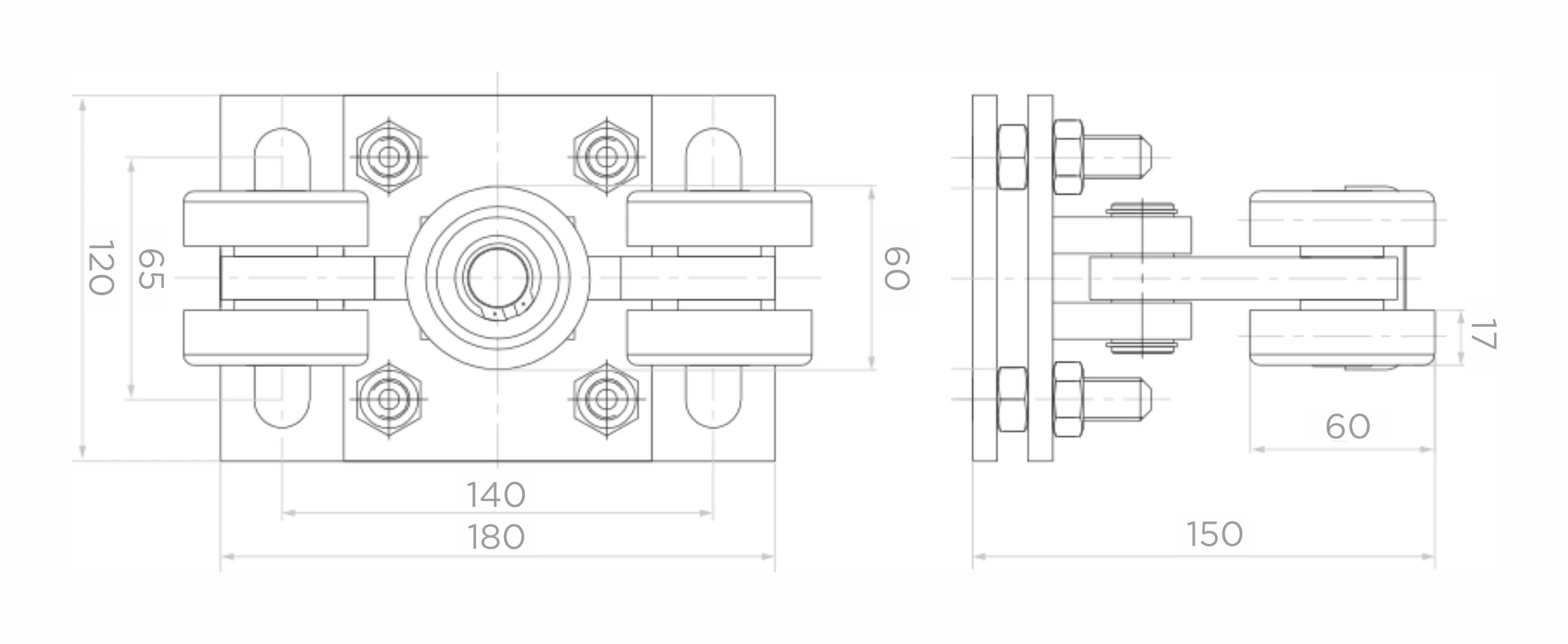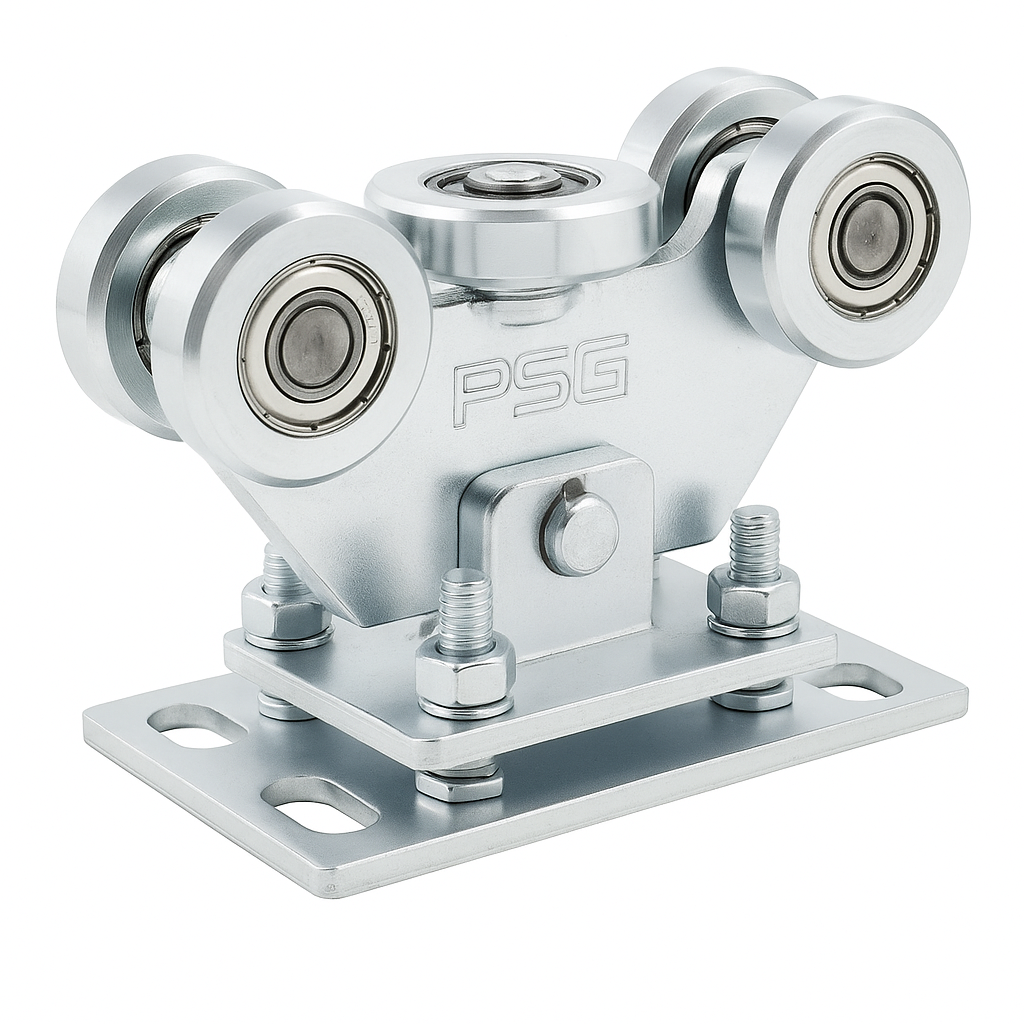 Vagnen är utrustad med 5 stålrullar, varav en horisontell rulle, som samverkar med en ledskena med dimensionerna 70×70×4 mm. Alla rullar är monterade på kullager, vilket garanterar lågt rullmotstånd och tyst drift. Den svängbara mekanismen gör det möjligt för vagnen att röra sig i förhållande till monteringsbasen – på så sätt kompenseras mindre ojämnheter och böjningar i skenan, och belastningen fördelas jämnt över samtliga rullar.