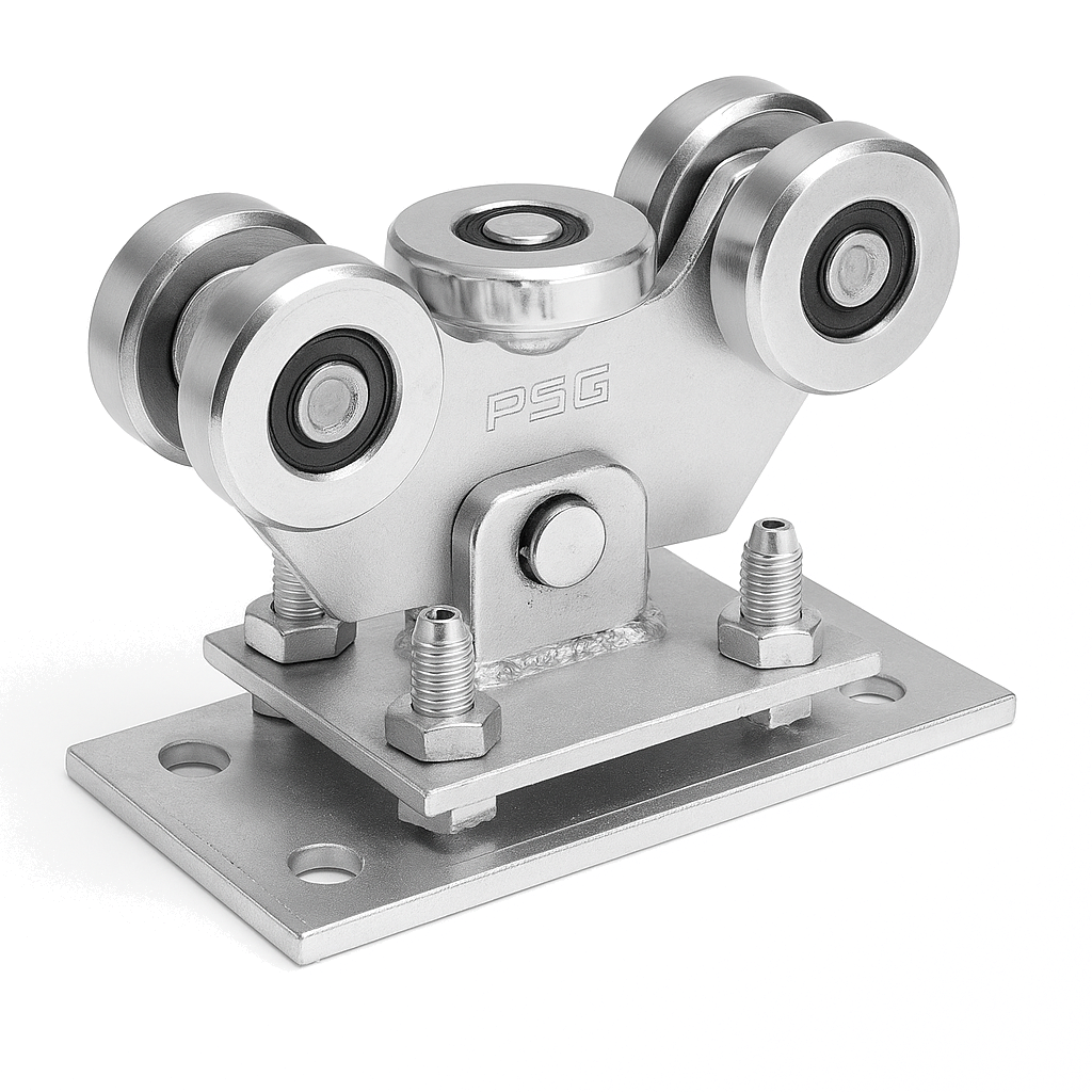 Vagnen är utrustad med 5 metallrullar monterade på lager, vilket säkerställer en jämn lastfördelning på styrskenen. Den horisontella rullen stabiliserar grindets sidorörelser och eliminerar slag och vibrationer under förflyttning. Den svängbara mekanismen (tapp som förbinder vagnen med monteringsbasen) möjliggör automatisk kompensation för mindre skenavvikelser, vilket avsevärt underlättar montering på ojämnt underlag.