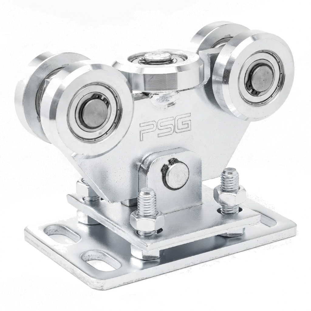 Vagnen är utrustad med 5 stålrullar, varav en horisontell rulle, som säkerställer stabil styrning av grinden i skenan. Anslutningen till monteringsbasen sker via en tapp, vilket möjliggör svängbar anpassning till skenan och kompensation för mindre ojämnheter i löpbanan.