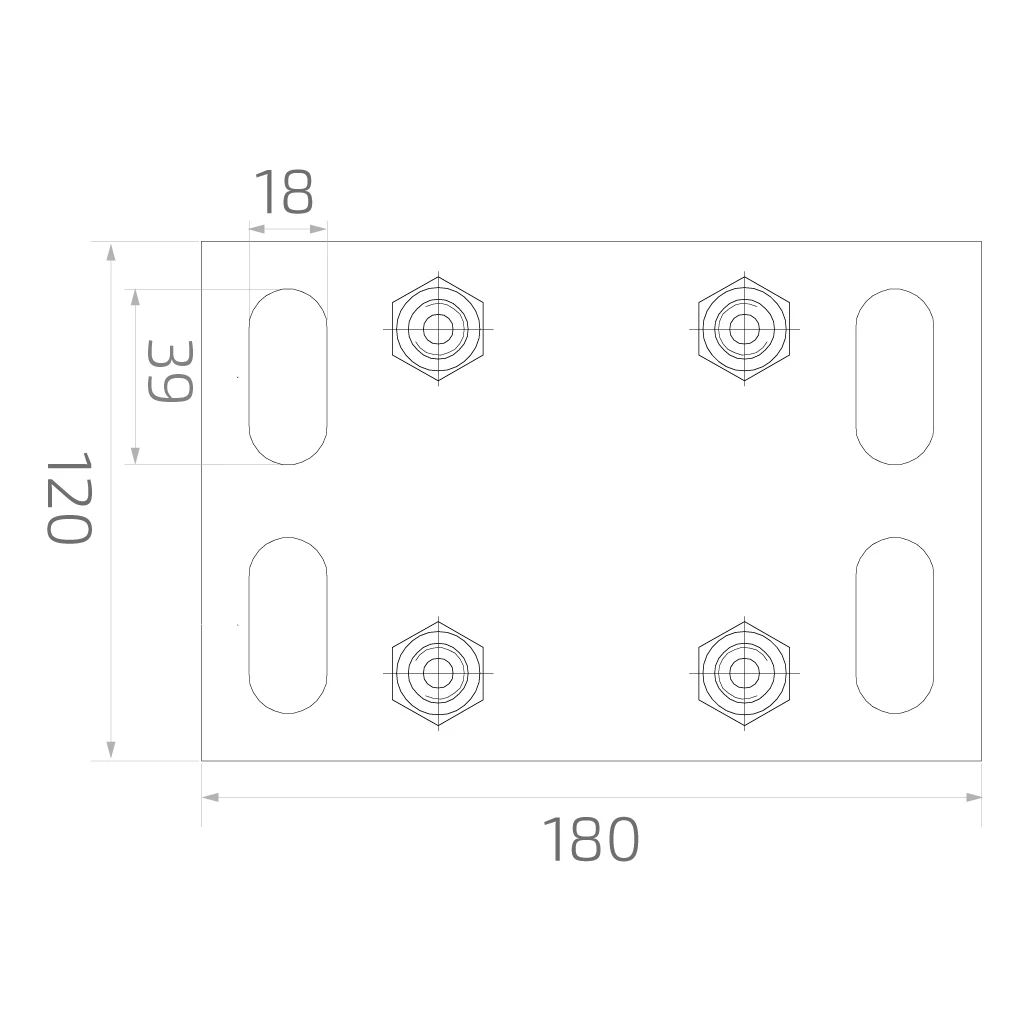 Monteringsbasen med måtten 180×120 mm har avlånga hål (18×39 mm) som underlättar justering av vaggens position vid infästning i fundamentet. Rullarnas inbördes avstånd är 140 mm i längsled och 68 mm i tvärled, och vagnens totala djup inklusive rullar är 155 mm.