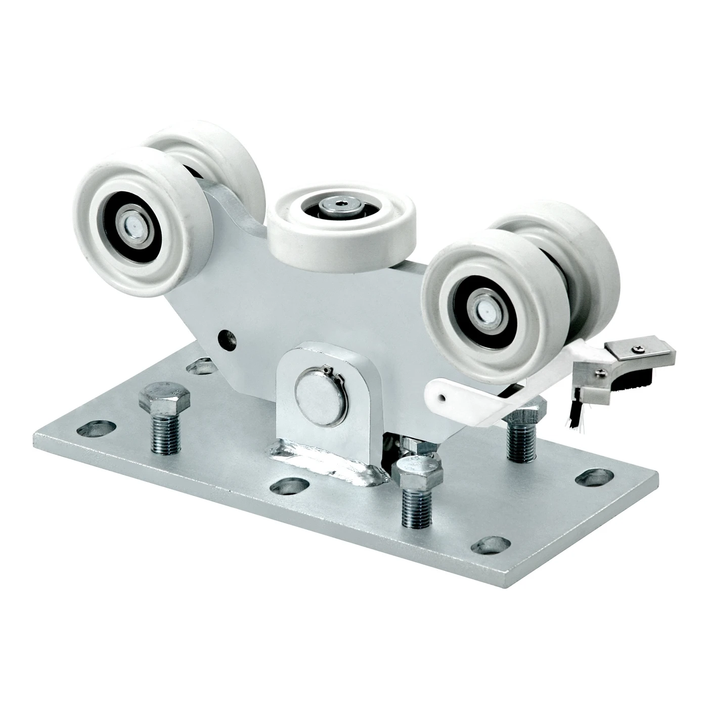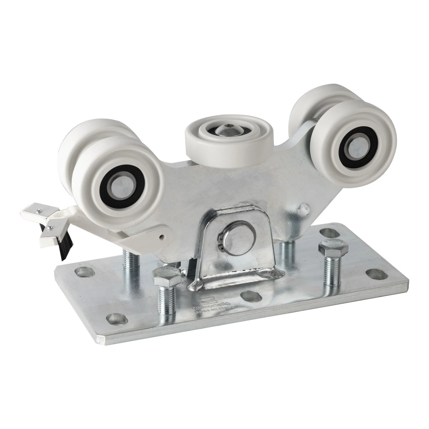 Vagnen består av en massiv monteringsplatta som fästs i grindgrunden samt ett hölje med fem rullar – tre huvudbärande och två sidostyrande. Nylonrullarna är monterade på lager och ger mjuk rörelse även vid höga belastningar. Låselementet (klämman) möjliggör säker låsning av grindskena i vagnens spår. Tack vare den genomtänkta konstruktionen är monteringen snabb och kräver inga specialverktyg – det räcker att skruva fast monteringsplattan i grunden med bultar genom monteringshålen.