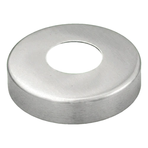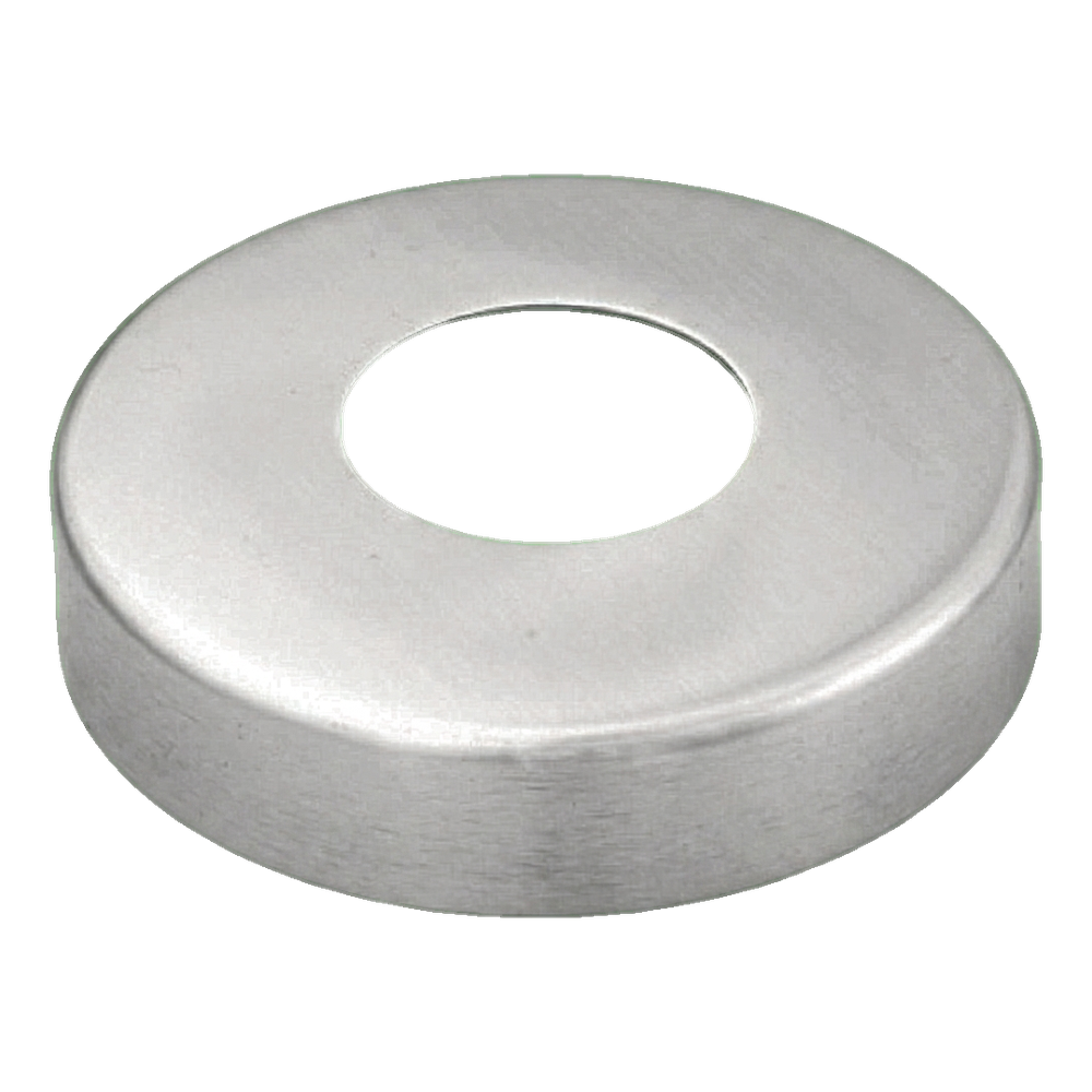 Rund maskerings-rosett i rostfritt stål AISI 304 med satinerad yta — estetiskt detalj avsedd för att täcka monteringshål runt räckerör med diameter 42,4 mm. Tack vare exakt passform och högkvalitativt material ger maskrings-rosetten räcket ett professionellt, rent utseende och eliminerar synliga genomföringar av röret genom golv, tak eller plattform.