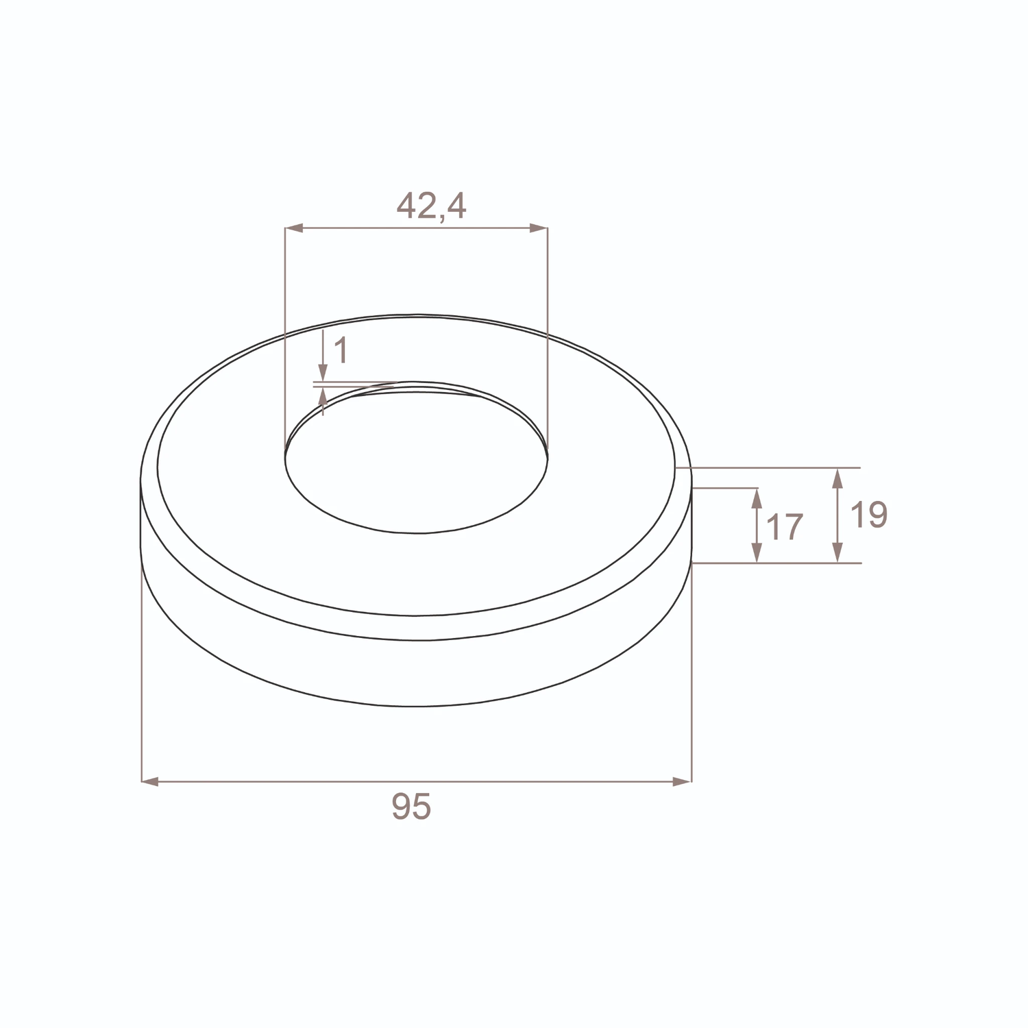 Rund maskeringsrosett med fläns avsedd för rör med diameter Ø42,4 mm, tillverkad av rostfritt stål AISI 304 med spegelfinish på ytan. Används för estetisk maskering av balustradstolpars baser, döljer monteringshål, fästskruvar samt ojämna svetsar. Genom användning av syrabeständigt stål skyddar den effektivt konstruktionen mot korrosion och väderförhållanden, vilket säkerställer mångårig hållbarhet både inomhus och utomhus.