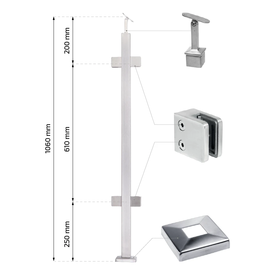Mittenstolpe för räcke i rostfritt stål AISI 304 med profil 40×40 mm och höjd 1060 mm — komplett set med fyra glasfästen, handledsstöd, täckplatta och gummipackningar. Satinerat utförande ger ett elegant, modernt utseende som harmoniserar perfekt med både balkong- och trapprräcken. Robust konstruktion och precis tillverkning möjliggör snabb, professionell montering.