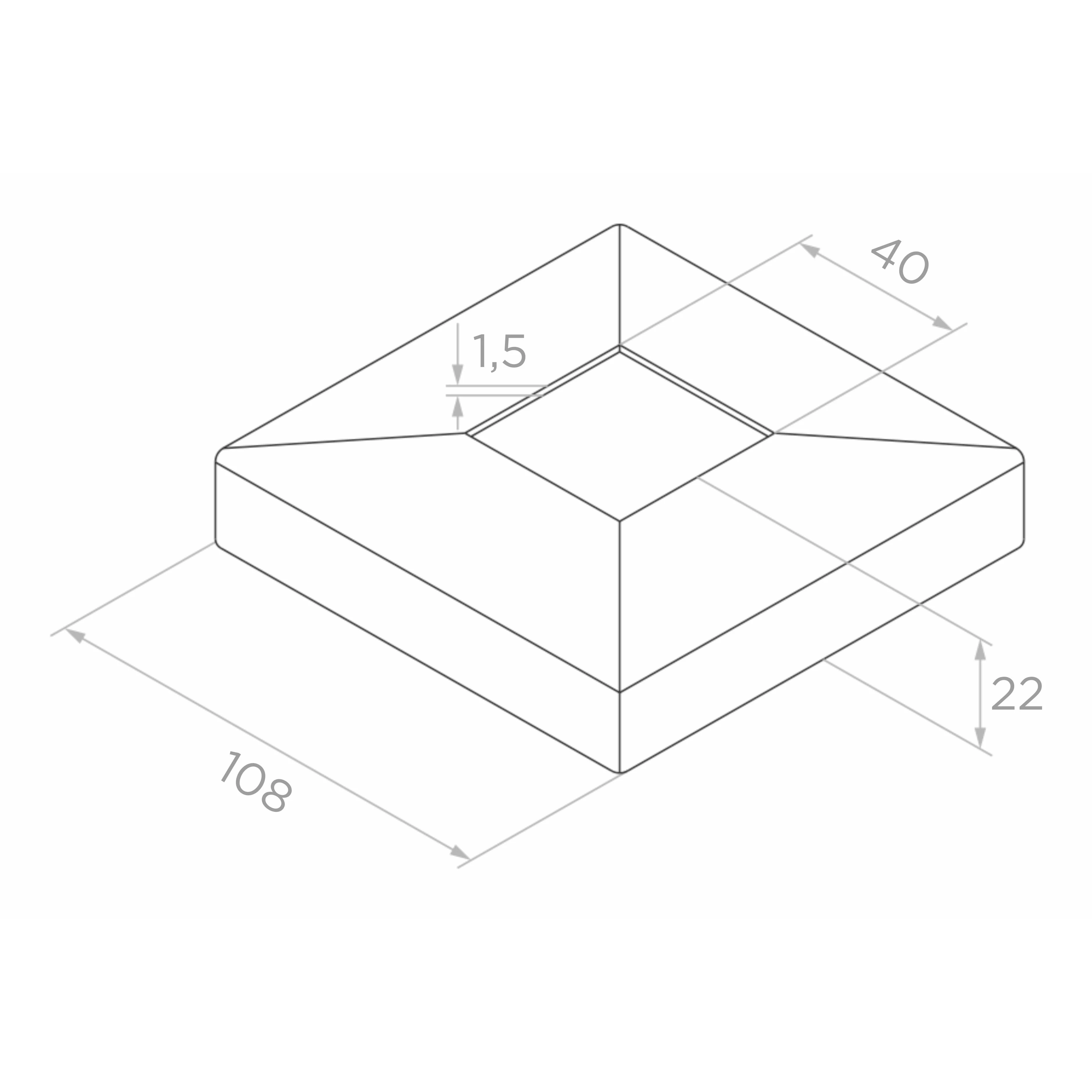 Bastäckplatta med måtten 108×108 mm och höjd 22 mm (plåttjocklek 1,5 mm) täcker estetiskt stolpens monteringsplats i golvet och ger en snygg finish.