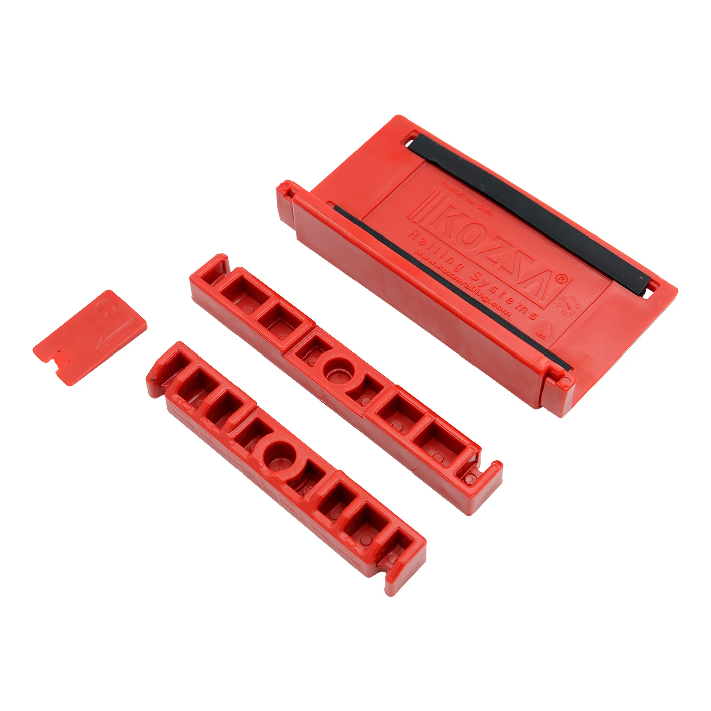 Satsen innehåller speciella plastmontagelement som säkerställer en säker och repeterbar positionering av glaset längs hela profilens längd. Varje komplett set består av ett huvudstabiliseringselement, två sidoskenor och ett säkringsklips — totalt 20 kompletta set i satsen, tillräckligt för en profil med längden 5 meter.