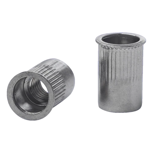 Konisk reducerad fläns med räfflad axel säkerställer säker placering i monteringshålet — räfflingen förhindrar att nitmuttern roterar under åtdragning och användning, och den koniska flänsen garanterar tätt, jämnt anliggande mot ytan på det fästa elementet. Denna lösning är särskilt viktig vid montering av räcken och handräcken, där anslutningens stabilitet direkt påverkar användarnas säkerhet.