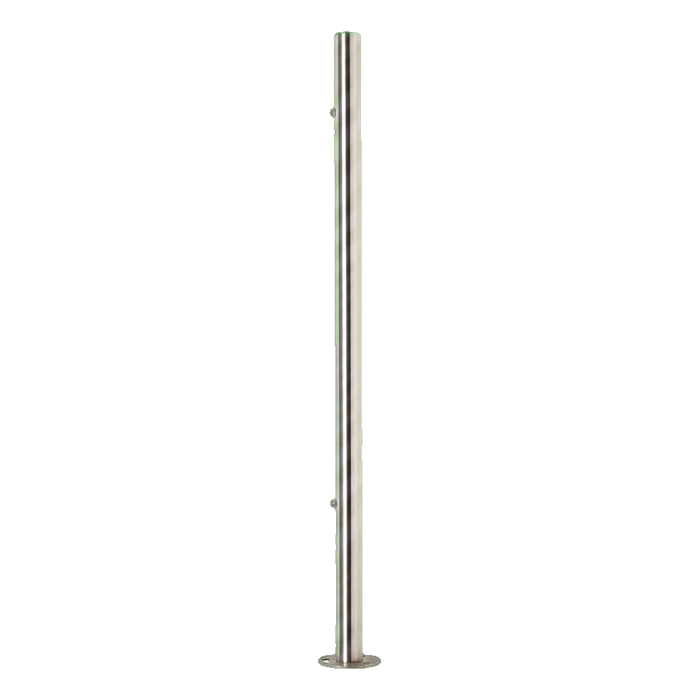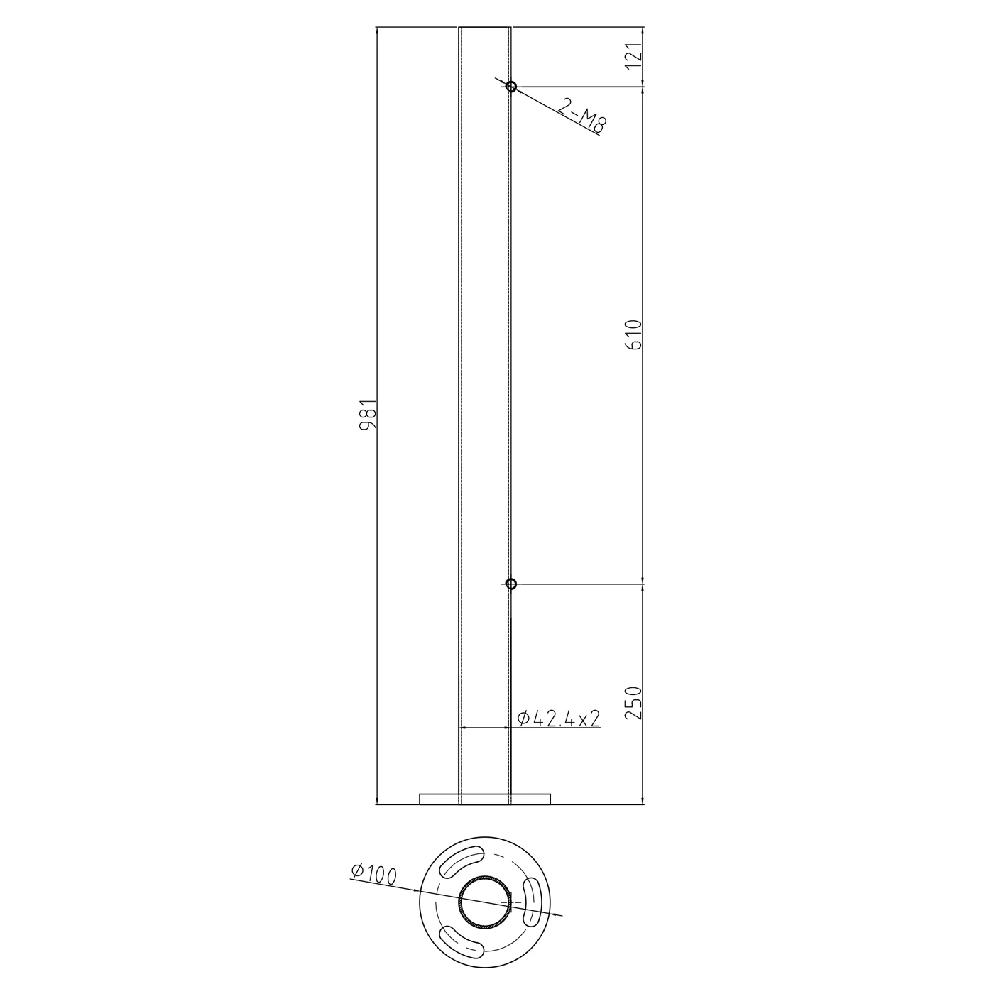 Stolpen har 2 hål med gänga M8 placerade på kroppen med centrumavstånd 610 mm. Det första hålet befinner sig 121 mm från övre kanten, det andra — 250 mm från stolpens undre kant. Detta arrangemang möjliggör enkel och snabb skruvmontering av valfria fästen för rör, stavar eller glas, vilket ger installatören full kontroll över balustradkonfigurationen.