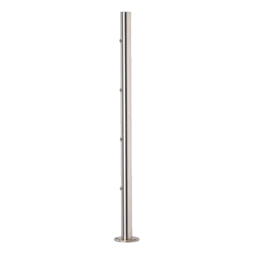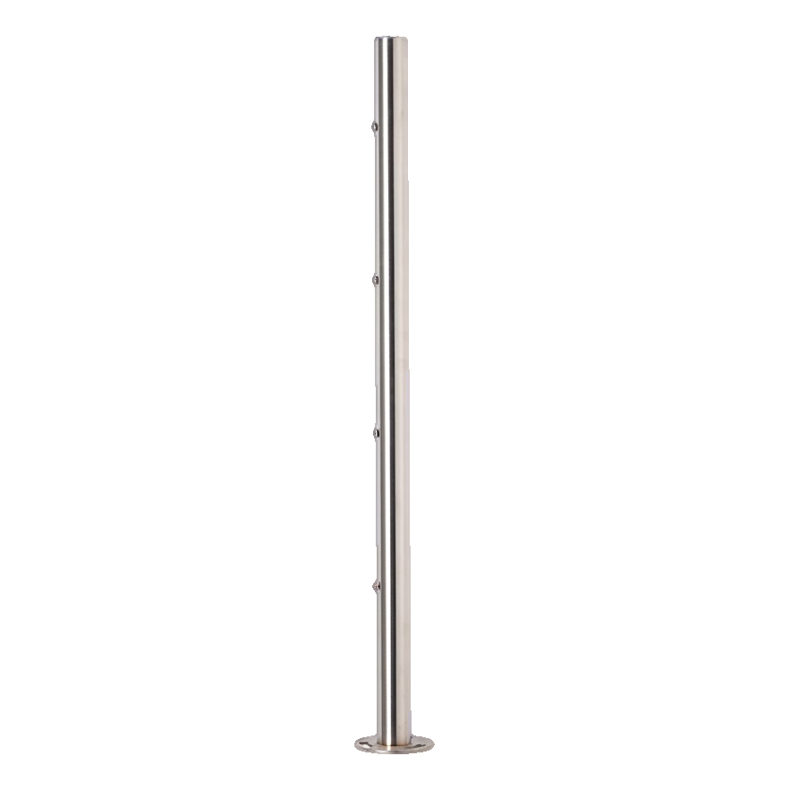 Rostfritt stål AISI 304 säkerställer hög korrosionsbeständighet och motståndskraft mot väderförhållanden, vilket gör att stolpen fungerar bra både inomhus och utomhus — på balkonger, terrasser eller i trapphus. Satinutförandet av ytan ger produkten ett modernt, matt utseende som harmoniserar perfekt med andra komponenter i balustradsystem.