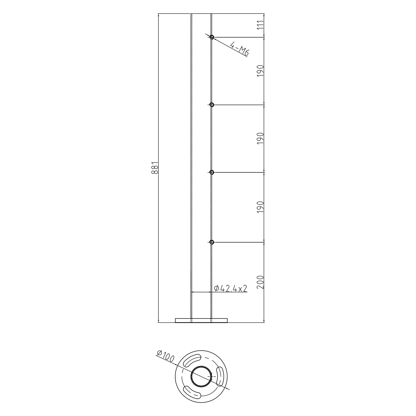 Den påsvetsade monteringsfoten med diameter ø100 mm med tre bönformade hål placerade med 120° mellanrum monteras direkt i golvet. Detta monteringssätt garanterar stabilitet och säkerhet för konstruktionen även på platser med hög trafikintensitet, såsom trappor i offentliga byggnader, hotell eller kontorsbyggnader.