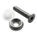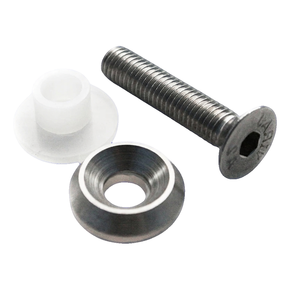 Uppsättningen är avsedd för fastsättning av glasskivor i rostfria balustradkonstruktioner som monteras på plana ytor. Det koniska huvudet på skruven DIN 7991 försvinner in i den koniska brickan och skapar en slät, elegant yta på den synliga sidan. Isolerhylsan av plast går genom hålet i glaset och säkerställer fullständig separation av material – eliminerar risken för termiska sprickor och galvanisk korrosion. Tack vare uppsättningens kompletthet behöver installatören inte välja separata brickor och isolatorer, vilket påskyndar monteringen och minimerar risken för misstag på byggplatsen.
