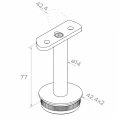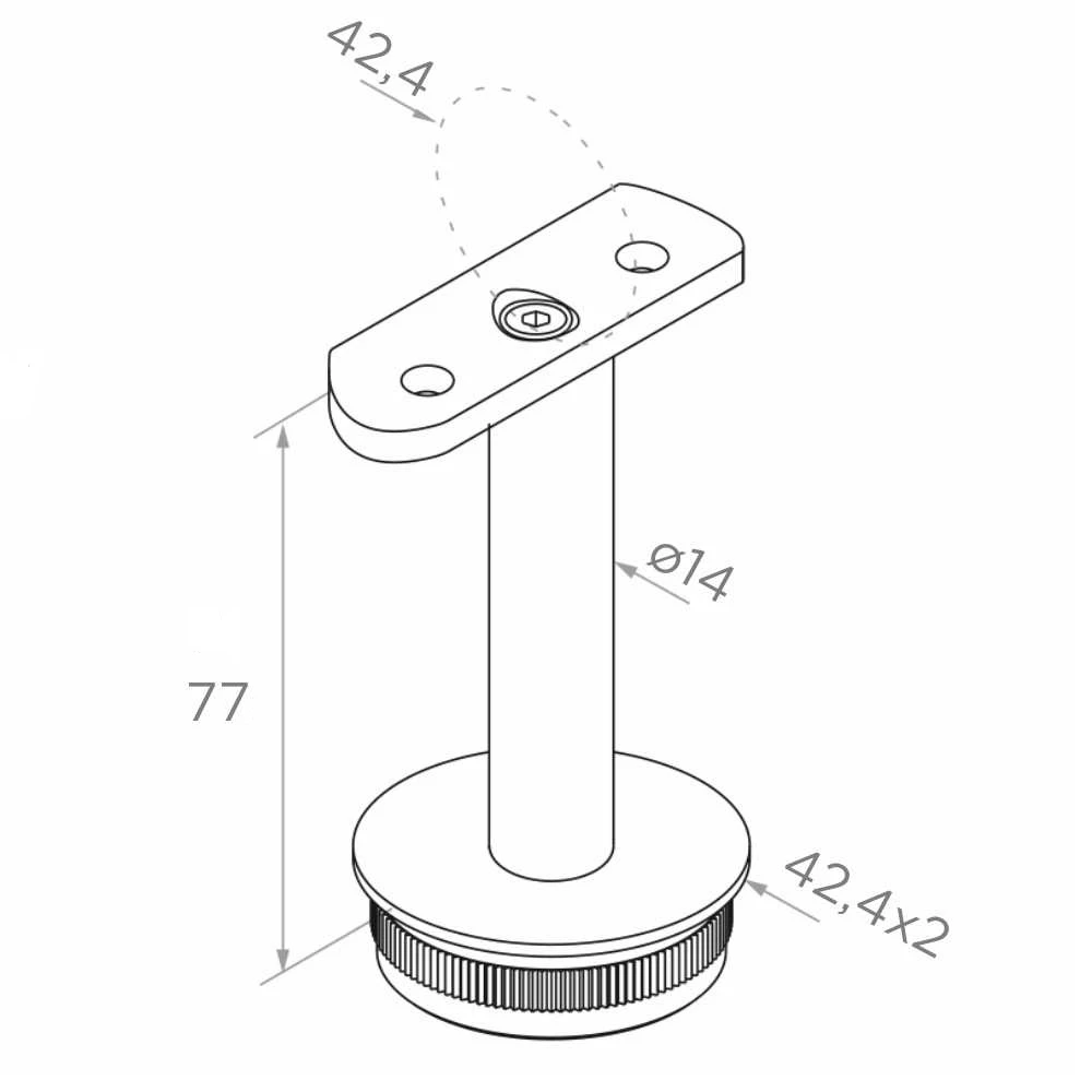 Stödets konstruktion är anpassad för balustradsystem 42,4 mm. Den nedre delen med räfflad kant slås in i stolpröret med dimension 42,4 × 2 mm (ytterdiameter × väggtjocklek), och det övre sadeln med profilerad kurvatur passar handledaren med diameter 42,4 mm. Det vertikala stiftet med diameter ø14 mm säkerställer tillräcklig styvhet för hela förbindelsen.