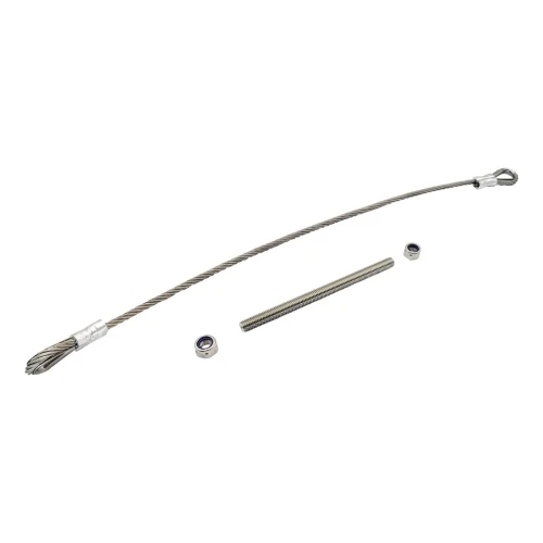 I satsen ingår en stålvajer med ögon (kausar) i båda ändarna, en gängad stång M12 samt två självsäkrande muttrar. Enkel montering möjliggör snabb installation av säkerhetsanordningen på befintliga dörrar utan att dessa behöver demonteras.